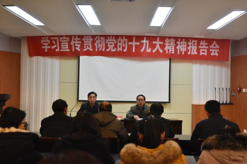 12月26日上午,校党委党的十九大精神宣讲组成员、校纪委副书记、监察处长王宾齐教授在大礼堂第三报告厅宣讲十九大精神,成人小说 教师及其他三个单位主要负责同志和党员参加会议。宣讲会由成人小说 党委书记李世欣主持。