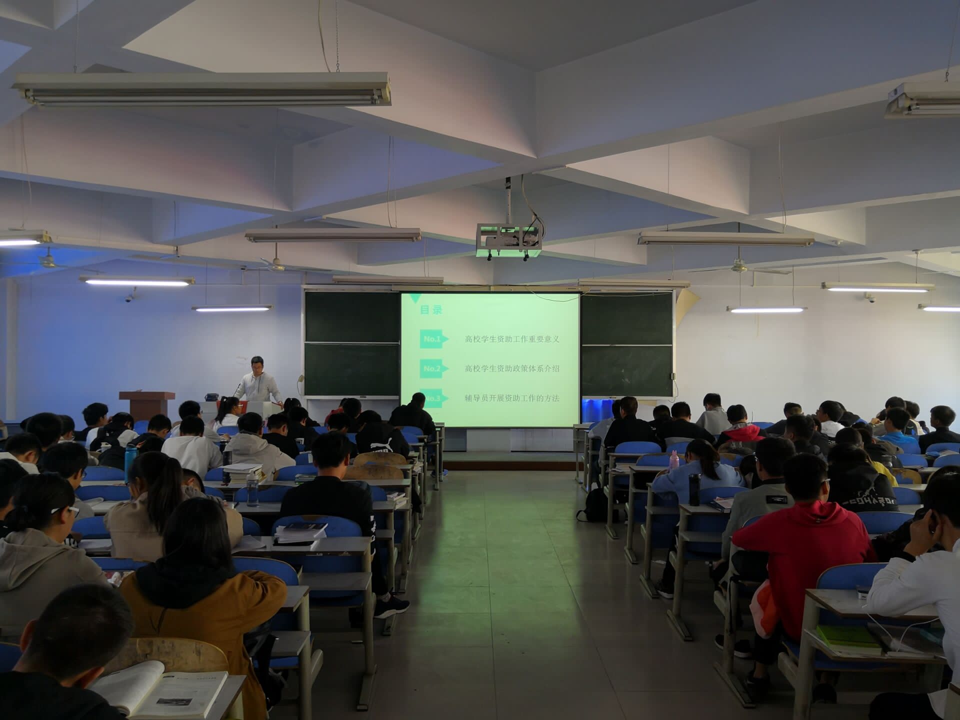 宋东皓从入学前的生源地信用助学贷款政策讲到了入学时的“绿色通道”政策,又详细讲解了入学后的国家助学、奖学政策,学费减免政策等,对各个资助政策的主要内容、申请条件、申请流程进行了深入细致地阐述。会上,宋东皓针对“奖、勤、助、补、贷”五位一体的资助政策进行了详细的讲解。他围绕国家奖学金、国家励志奖学金、国家助学金的申请条件、审核流程、材料提供、公示上报等内容展开,同时传达了国家和省学生资助管理中心的各项政策要求,接着又重点宣传讲了国家和我省的教育精准扶贫和建档立卡相关政策,教育引导家庭经济困难学生要自强自立、讲诚信、学会感恩回报,用自己的实际行动和优异成绩回馈学校和国家。