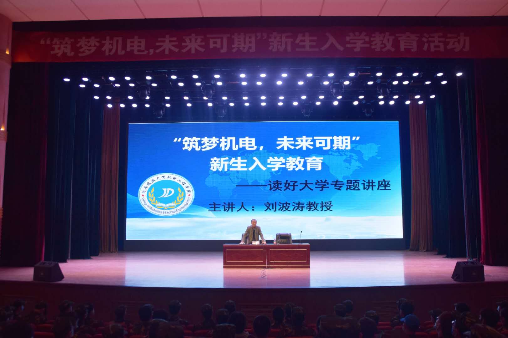 于校大礼堂举办“筑梦机电,未来可期”新生入学教育——读好大学专题讲座,此次讲座邀请校研究生教学督导、校关心下一代工作委员会委员刘波涛教授担任主讲,20级辅导员徐捧丽老师主持,全体20级新生和新生助理参加了此次讲座。