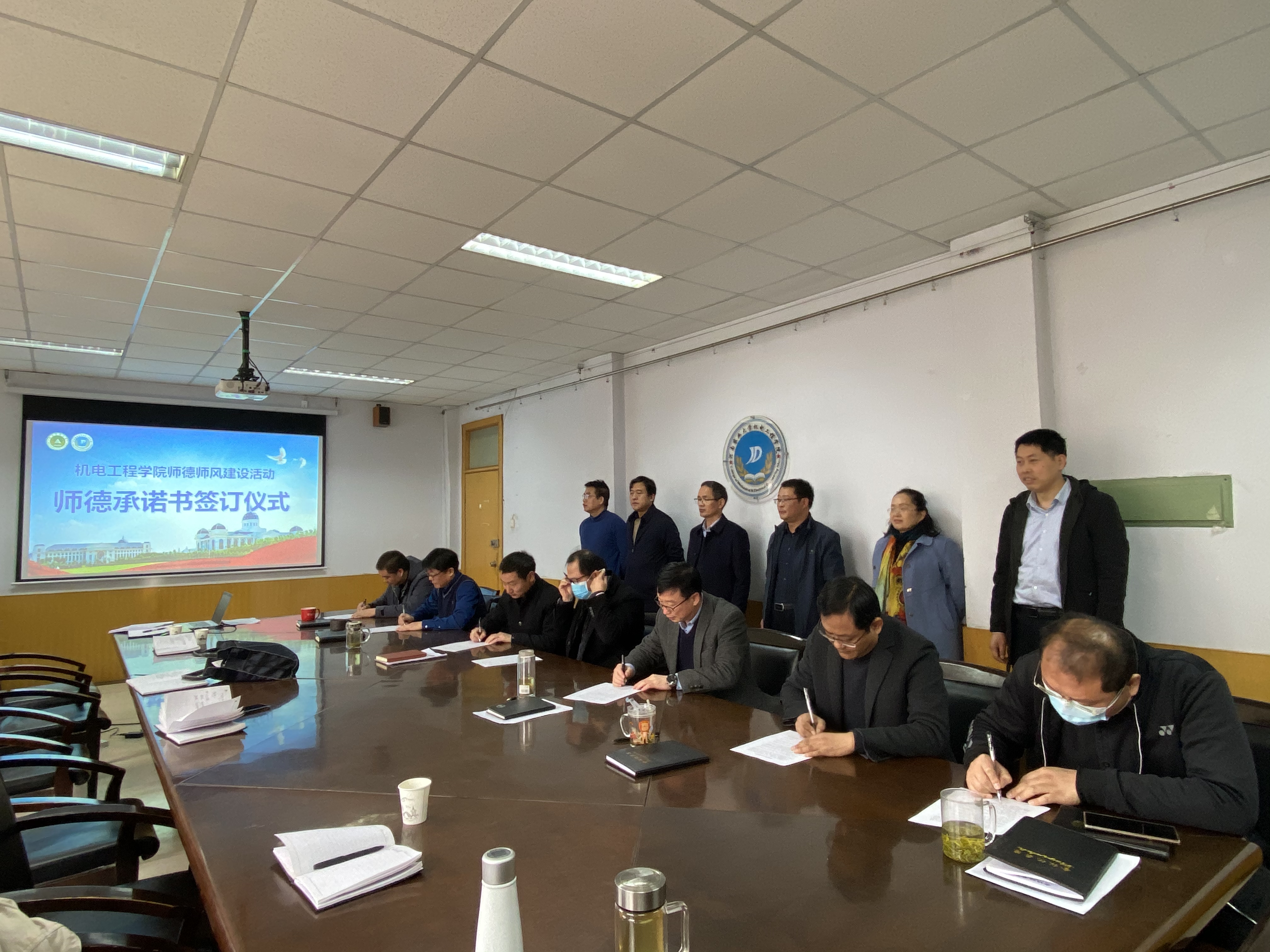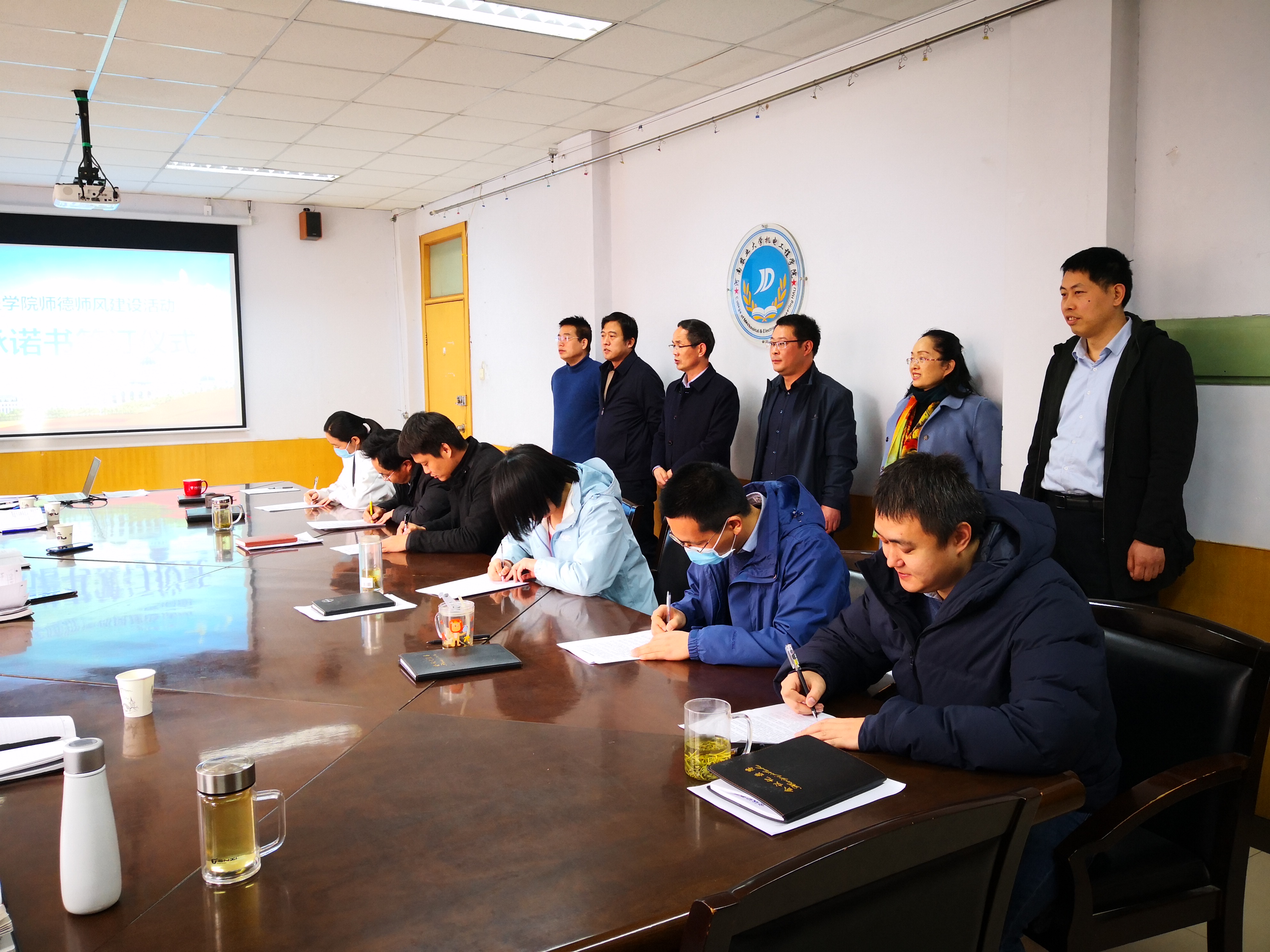 在15号楼二楼会议室举行师德承诺书签订仪式,学院领导班子、学院各教工党支部和各单位负责人参加活动。仪式由院长胡建军主持。