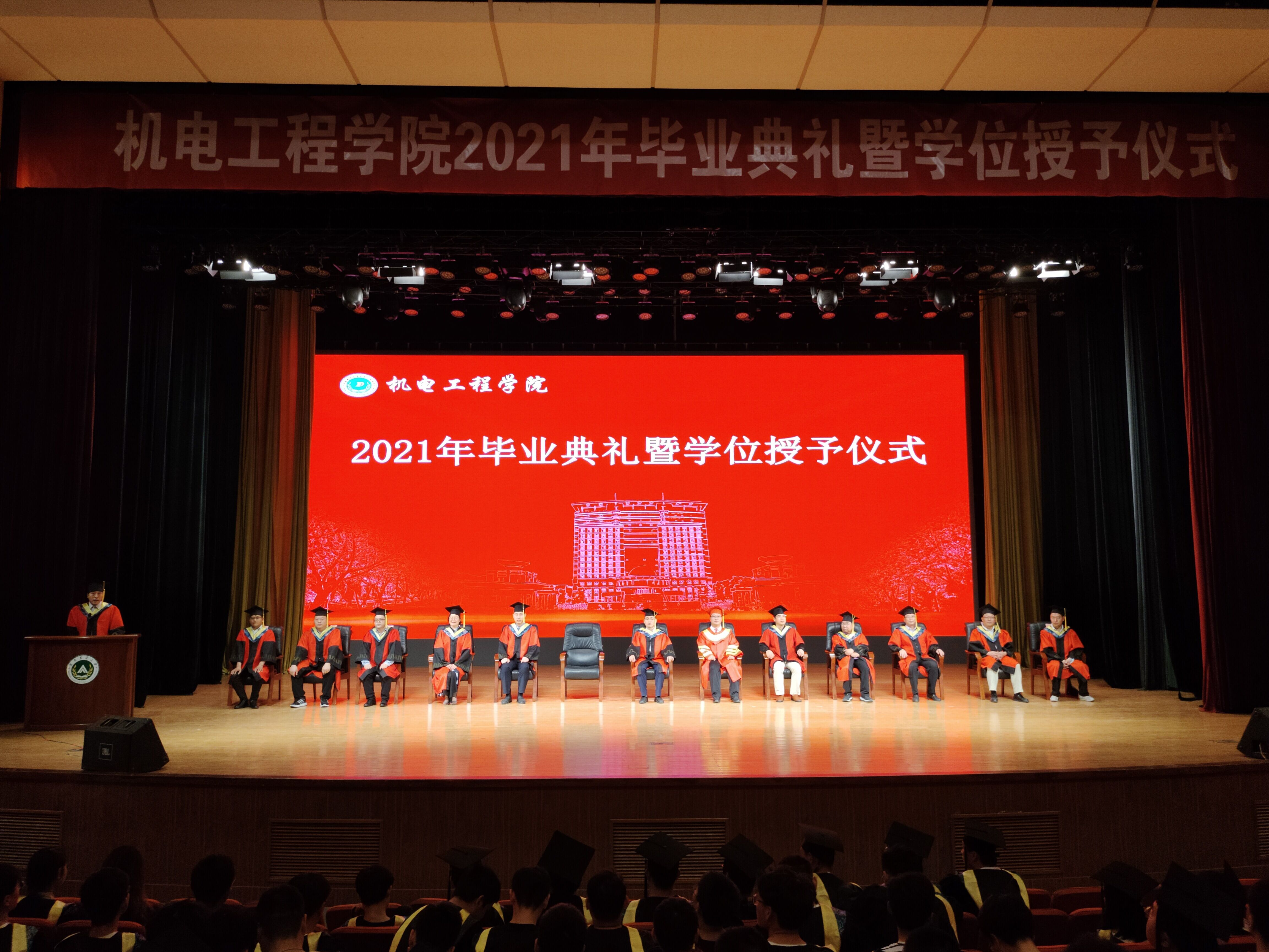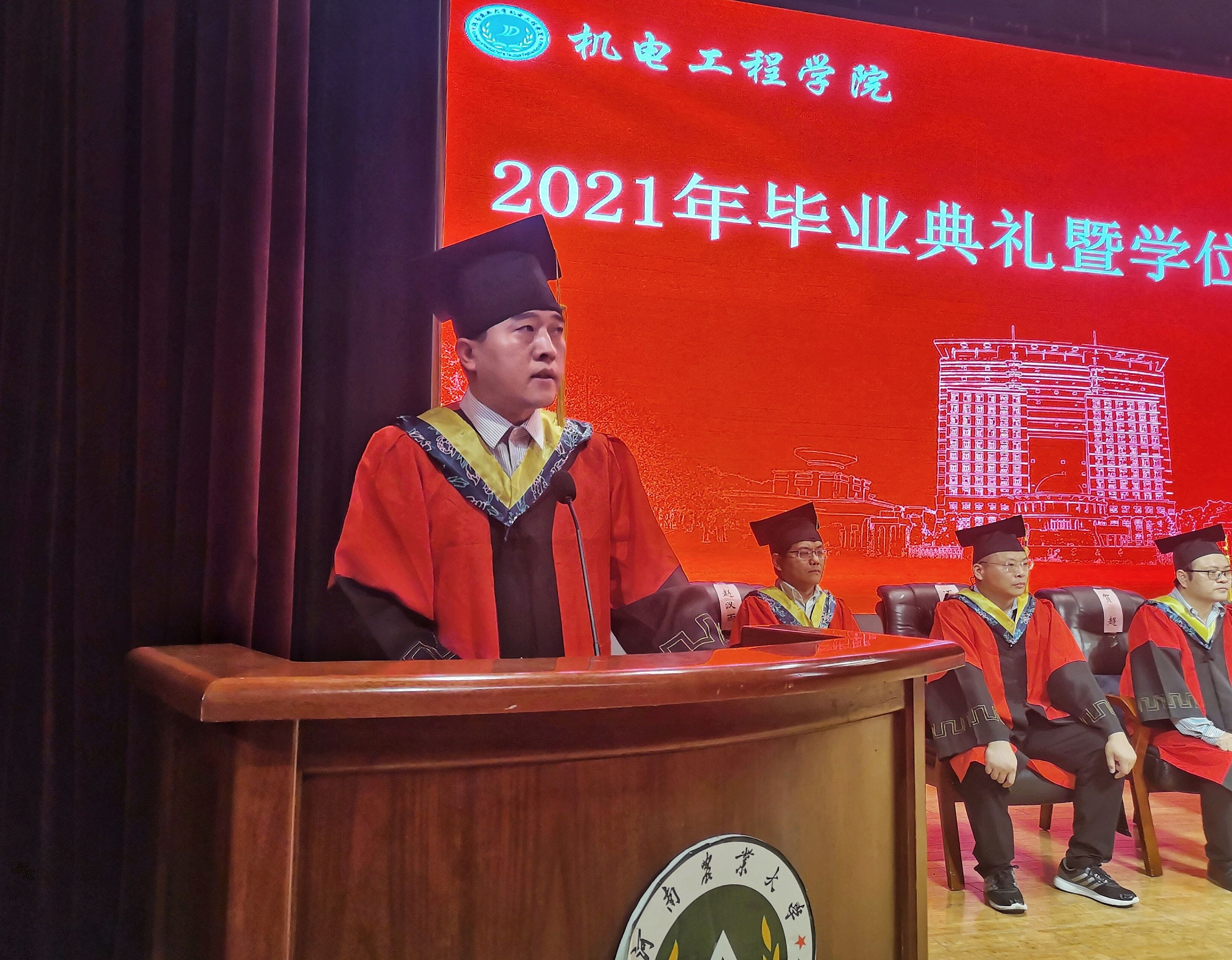 2021年毕业典礼暨学位授予仪式。院党委书记李世欣、院长胡建军、党委副书记赵宁、副院长胡建东、副院长王振锋、学位评定委员会全体委员、教师代表、辅导员老师出席本次毕业典礼。毕业典礼由赵宁主持。