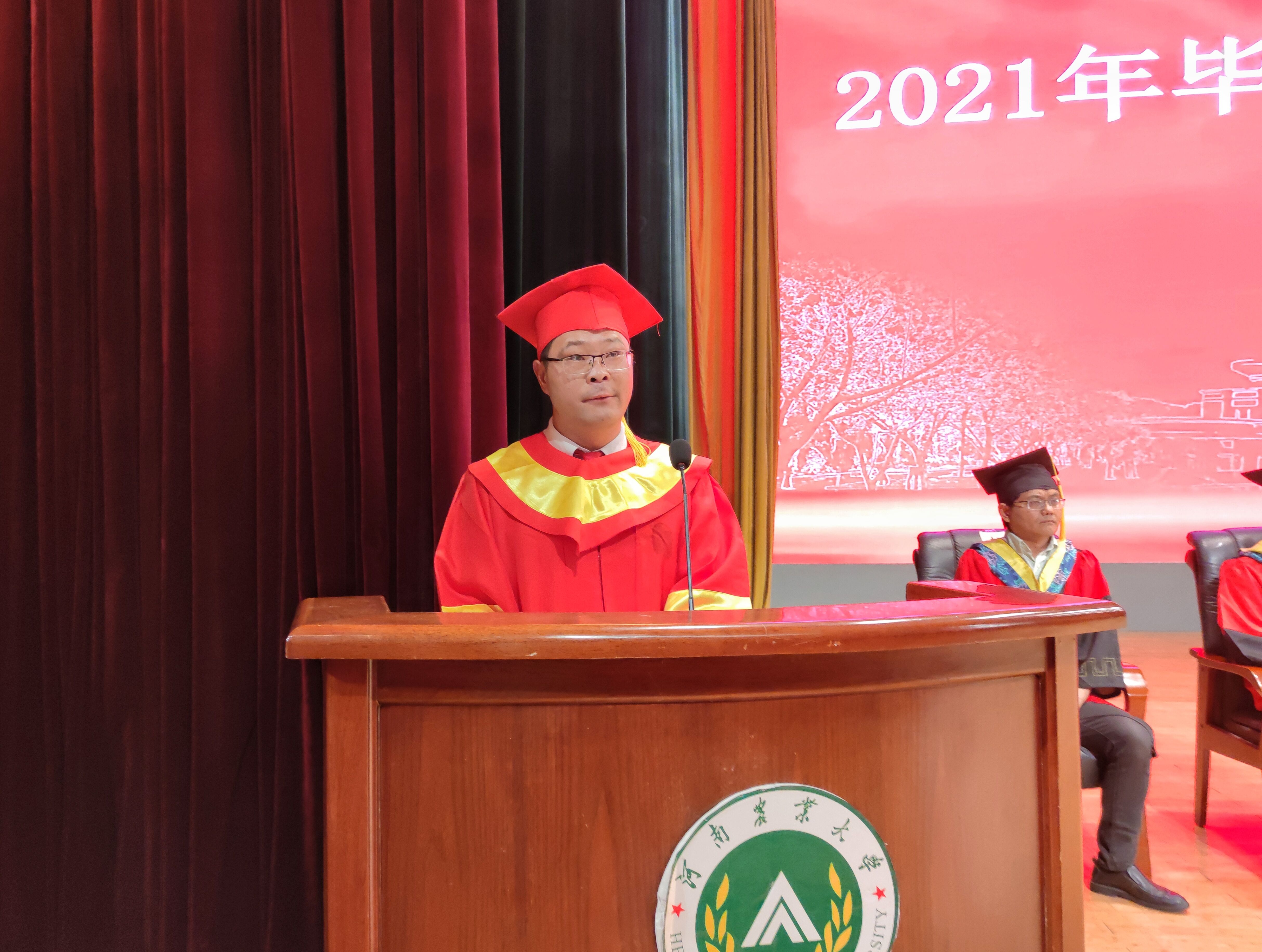 胡建军为全体毕业生讲话,他首先表达对2020届、2021届毕业生们成长成才的欣慰与自豪,对学院以及同学们四年来取得的成就作出肯定,并对全体师生表示感谢,他指出,学院成就的取得与全体师生的共同努力有不可分割的联系。其次,他勉励毕业生们在日后的人生路途中要牢牢记住三个“问题”:一、我是谁,同学们要准确知道“我是谁”,才能让自己的人生事业走向辉煌;二、到哪去,希望大家能把人生追求、社会发展、人生需要三者进行有机结合,用奋斗的精神激扬青春的美丽;三、怎么去,希望大家牢记“坚定、坚信、坚持”,坚定信念、坚守初心,坚持走下去。最后,他向毕业生们表达期望,希望同学们牢记“团结一致,奋力拼搏”的精神,敢于以天下为己任,创造属于自己的人生辉煌。