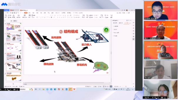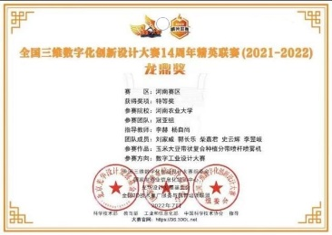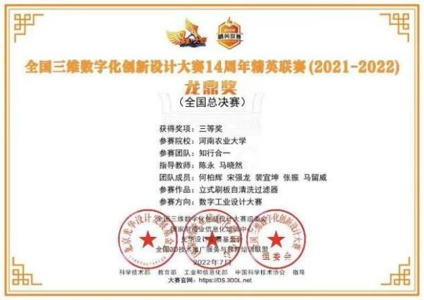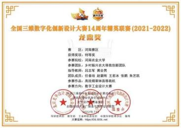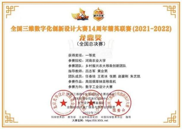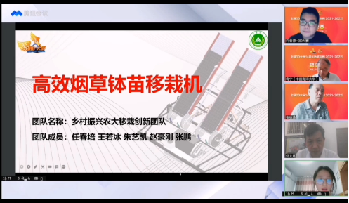 结合疫情防控要求,本届全国总决赛采用线上为主的方式进行,经过省赛层层选拔,本次年度总决赛超过400个团队参与角逐国赛龙鼎大奖,为保证大赛公平、公正、有序进行,总决赛所有参赛团队的竞赛顺序均以网络抽签决定。其中,由成人小说 吕志军、黄会男老师指导,任春培、王若冰、赵豪刚、张鹏、朱艺凯等本科生组建的“乡村振兴农大移栽创新团队”凭借《高效烟草钵苗移栽机》作品取得国赛一等奖;由陈永、马晓然老师指导,何柏辉、宋强龙、裴宜坤、张振、马留威研究生组建的“知行合一团队”凭借《立式刷板自清洗过滤器》作品取得国赛三等奖。