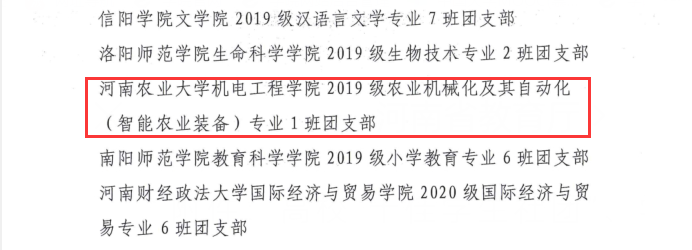 近日,共青团河南省委公布了2022年度“活力杯”河南学校共青团基层基础工作大赛获奖名单,本次大赛共有1074个共青团工作项目,442个微团课,427名团支书和395个团支部参赛,其中,成人小说 2019级农业机械化及其自动化(智能农业装备)1班团支部书记郭滨恺荣获河南学校共青团十佳“魅力团支书”;2019级农业机械化及其自动化(智能农业装备)1班团支部荣获百优“活力团支部”。