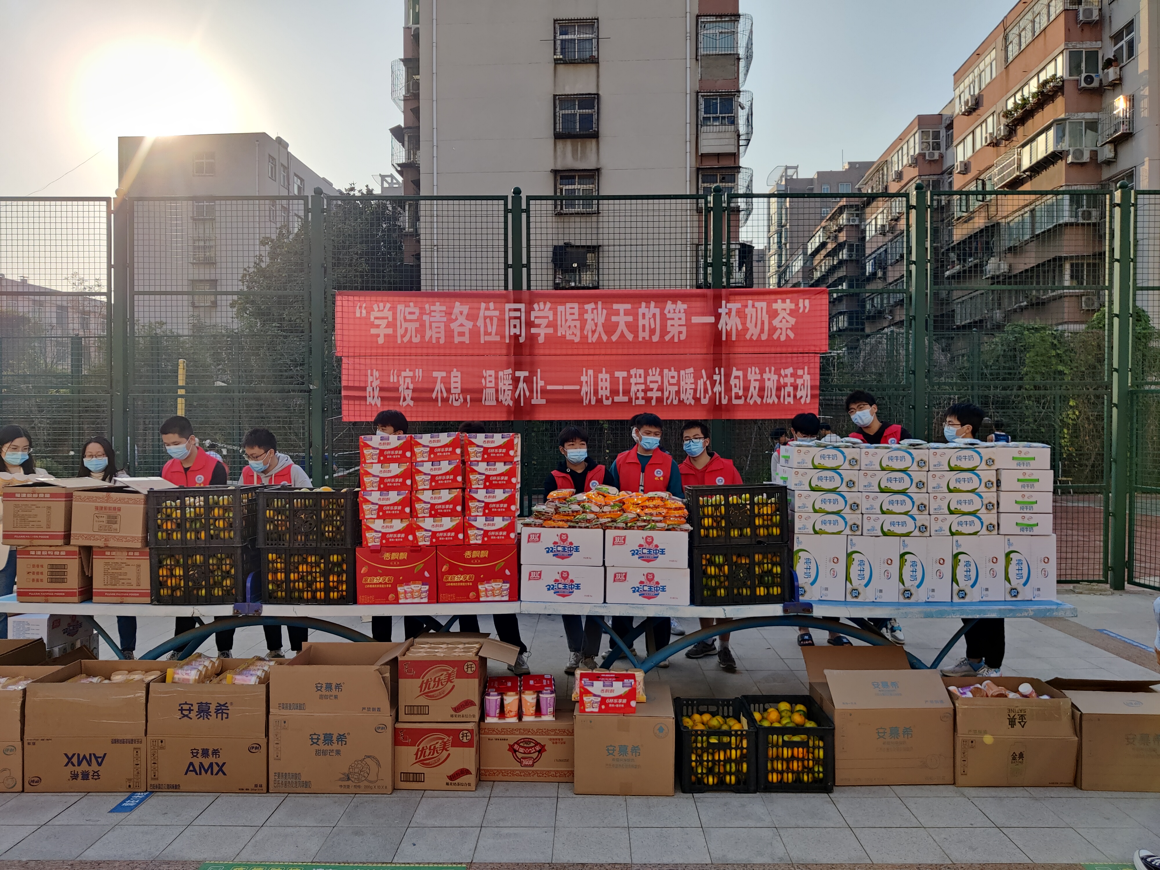 活动开始前,志愿者们早早抵达活动现场进行物资准备工作。他们身着红马甲,搬运一箱箱蜜橘、牛奶、香肠、奶茶、面包……这些物资承载着学院老师对学生们的无限关怀。活动期间,副校长尹新明、校团委书记贾云飞等领导老师亲切和学生交谈,为学生发放暖心礼包,并鼓励同学们积极乐观面对疫情,严格遵守学校各项防疫政策,积极配合学校防疫要求,全体师生上下一心,同心抗疫,共克时艰。活动现场,志愿者们有序组织二区学子按宿舍依次排队领取物资,同时认真做好登记,确保每个宿舍都领取到爱心物资。