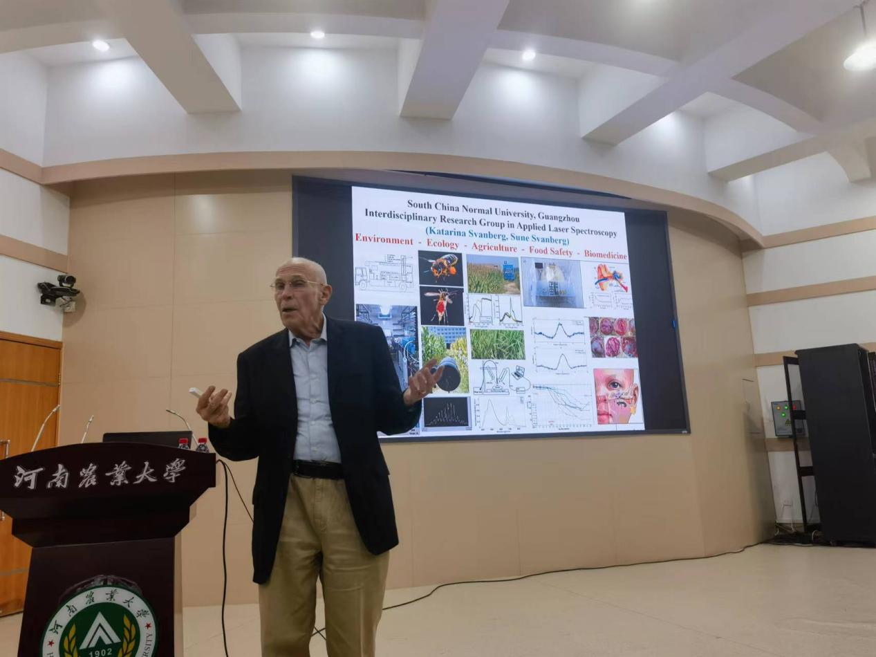 发展历史,希望双方接下来开展更深入的合作,共同推动农业领域的发展。随后,Sune Svanberg 院士进行简短发言,他对刘校长和国际合作处的会见表示了感谢,并表达了希望在激光光谱应用于农业领域开展更广泛合作的愿望。河南省农业激光技术国际联合实验室主任胡建东教授简要汇报了双方合作的主要成果。最后,两位教授参观了我校校史馆和省部共建小麦玉米作物学国家重点实验室,并对我校悠久的历史和丰厚的文化底蕴给予了高度评价。
