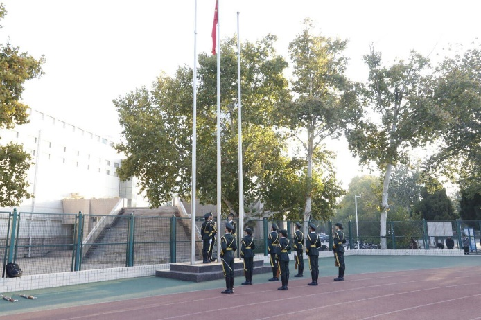 随着运动员入场完毕,国旗护卫队步伐坚定,雄壮有力,将国旗护送至升旗台,随着慷慨激昂的国歌响起,五星红旗冉冉升起,迎风飘扬。全场师生庄严肃立,面向国旗行注目礼。