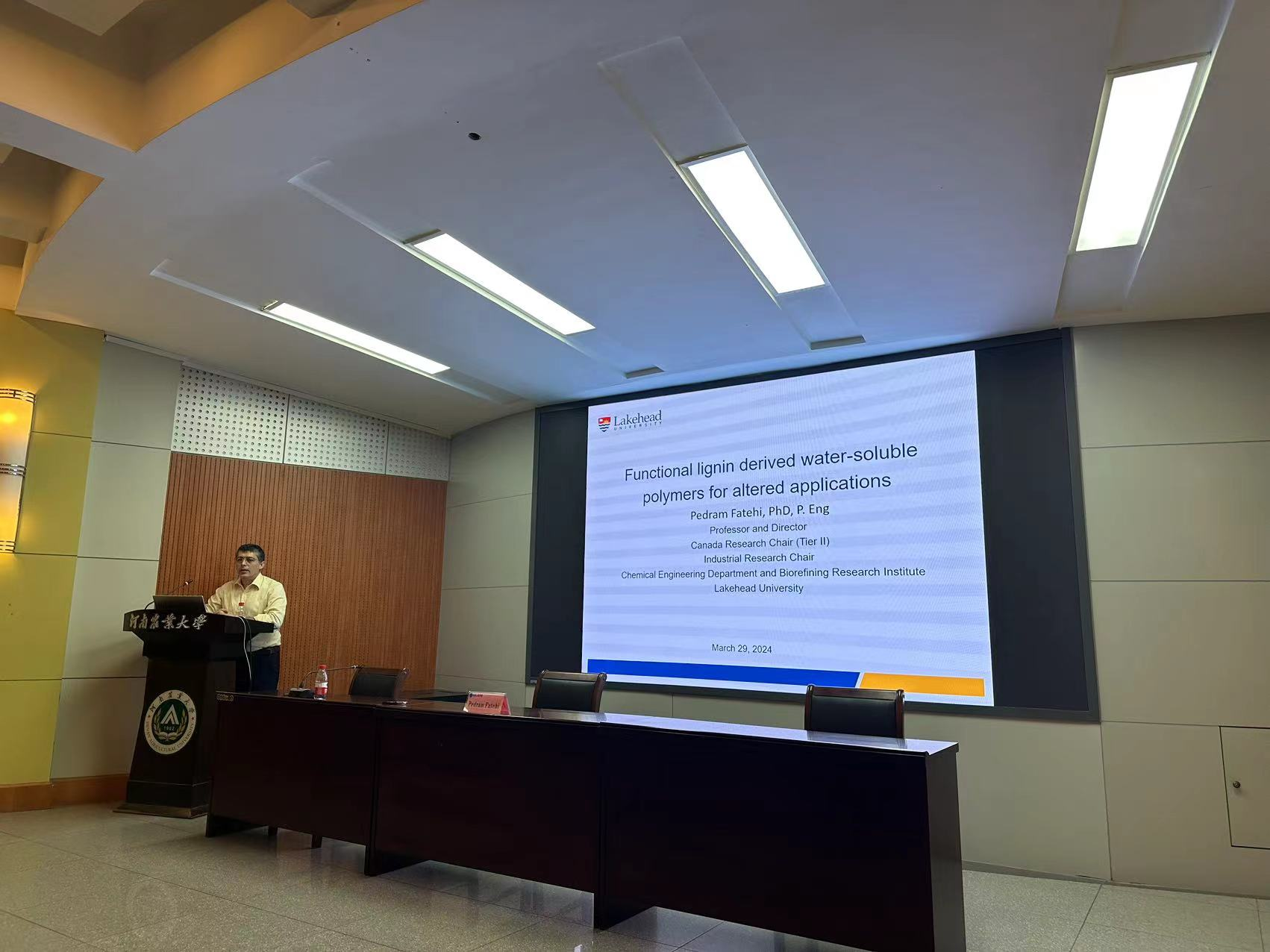 签约仪式结束后,Pedram Fatehi为在座师生作了题为Functional lignin derived water soluble polymers for altered applications(功能性木质素衍生的水溶性聚合物的应用研究)的学术报告,Pedram Fatehi的报告内容丰富、深入浅出,通过幽默风趣的讲授方式吸引了老师和学生的兴趣。在互动环节中,大家都积极提问,Pedram Fatehi与成人小说