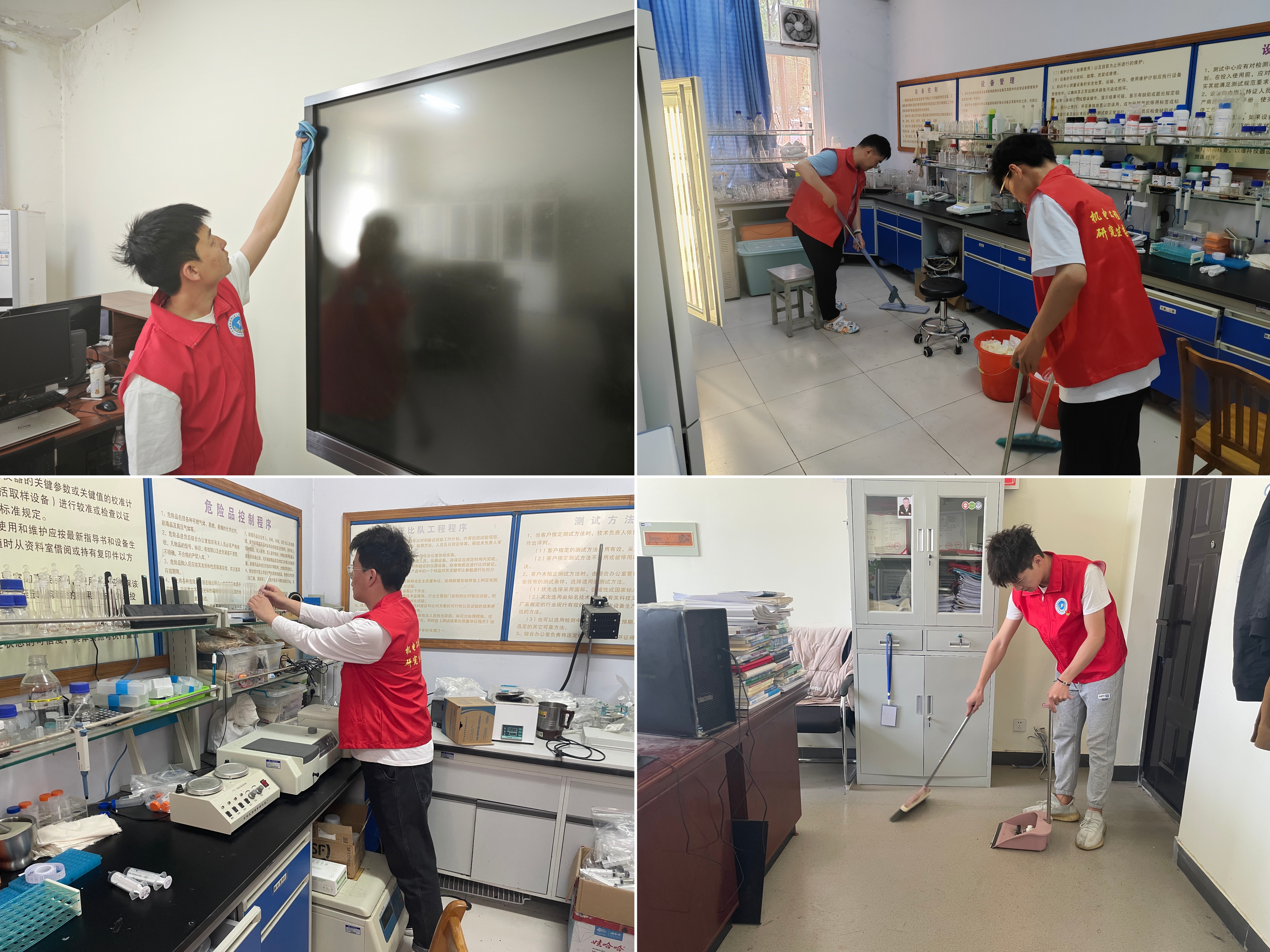 实验室安全管理工作,5月1日上午,在院党委指导下,党委副书记宋晶、院研工辅导员李锦带领留校研究生支部党员成立志愿者小组,开展“五一”假期实验室安全卫生自查自纠工作。