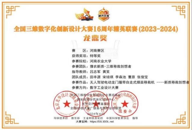 (一)第十一届“华中数控杯”全国大学生机械创新设计大赛。该赛吸引了全国730所高校的积极参与,共提交作品6386项参与预赛选拔。经过激烈角逐,成人小说 吕志军、祝英豪老师指导,张俊宝、黄海涛、孙坤铎、张一帆、王克震组建的团队凭借《回转式非圆齿轮行星轮系全自动辣椒钵苗移栽机 富农先锋--移栽先行》作品荣获国家二等奖、河南赛区一等奖;吕志军、黄会男老师指导,田丰源、宋培琪、姚贸斐、张俊宝、贾晓媛组建的团队凭借《成人小说 “新质移栽创想者”——无人驾驶电动龙门履带自走式茄子钵苗移栽机》作品荣获河南赛区二等奖。