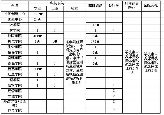 ▲ 表示分配给省级重点实验室各3项。(1)粮食作物生理生态与遗传改良重点实验室培育基地(2)河南省作物生长发育调控重点实验室(3)河南省动物性食品安全重点实验室(4)河南省动物生长发育调控重点实验室(5)河南省农村可再生能源重点实验室(6)河南省肉制品加工与质量安全控制重点实验室(7)河南省新型农药创制及应用重点实验室。