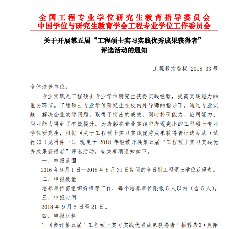 关于开展第五届“工程硕士实习实践优秀成果获得者”评选活动的通知