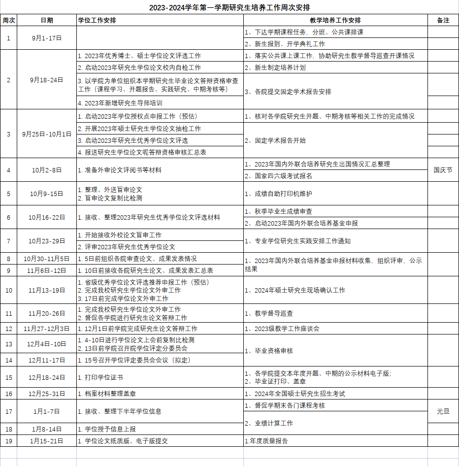 2023-2024学年第一学期学校研究生学位与培养工作周次安排