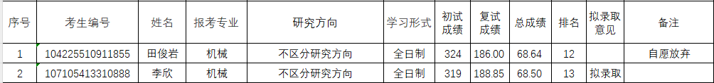 机械专业硕士研究生(全日制)第一次调剂名额为12个,对参加第一次调剂复试的考生,按照总成绩排名进行拟录取。现由于第12名考生自愿放弃拟录取资格,经学院招生工作领导小组研究,决定顺次补录排名第13名的考生,现将拟录取结果予以公示。
