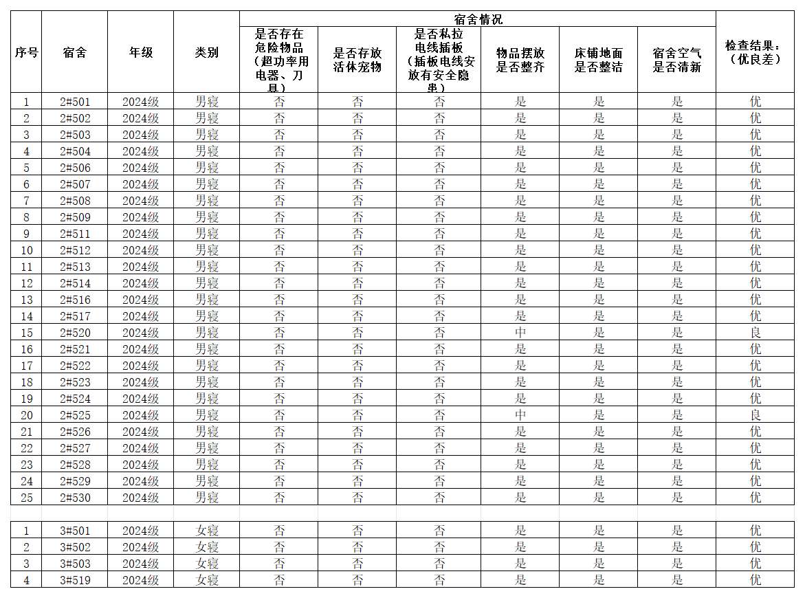 为加强成人小说 宿舍安全文明建设,促进学生全面发展,引导同学营造健康文明、积极向上的生活环境,学院研究生会生活部对24级宿舍进行安全卫生检查,检查情况公示如下: