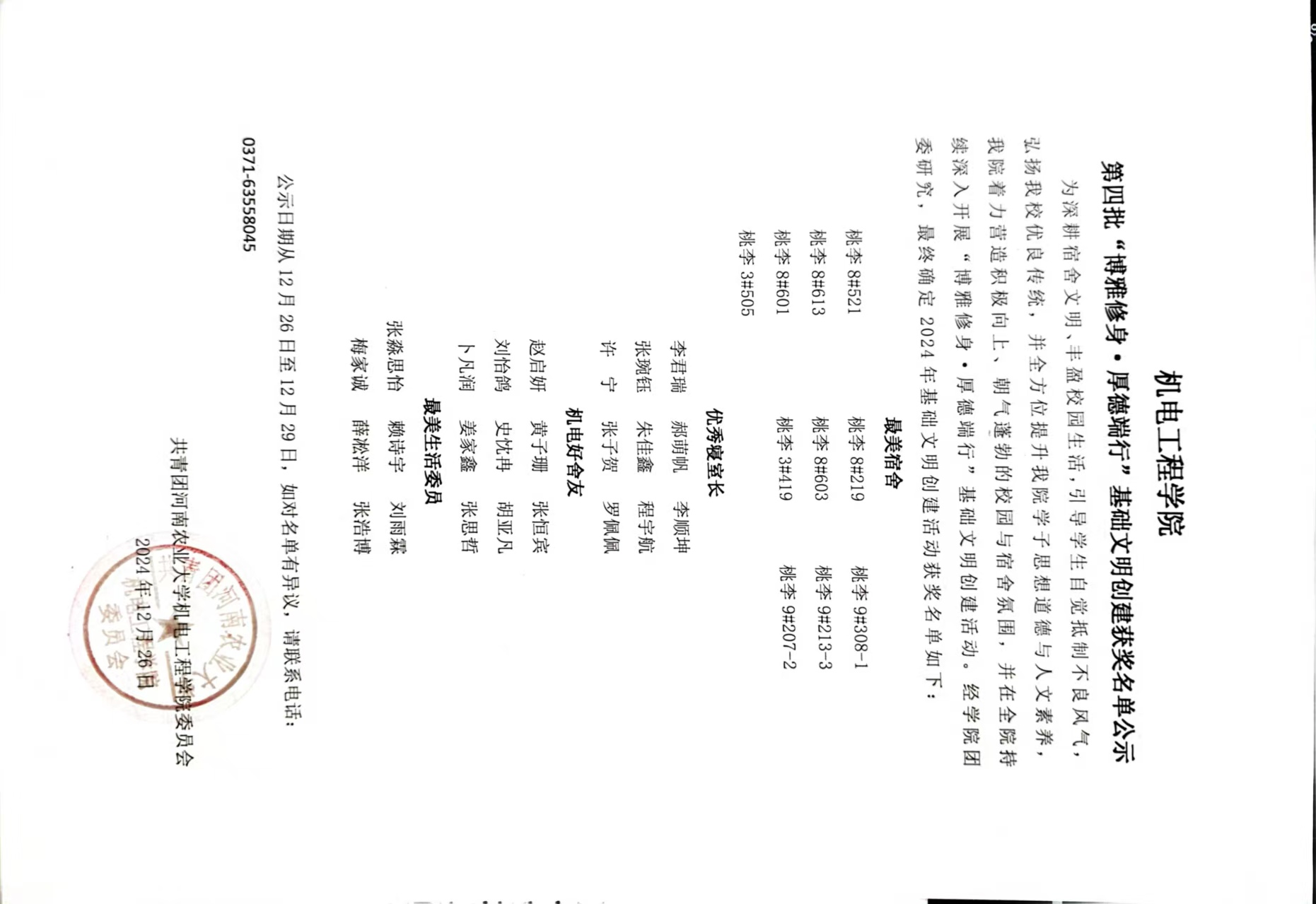 为深耕宿舍文明、丰盈校园生活,引导学生自觉抵制不良风气,弘扬我校优良传统,并全方位提升成人小说 学子思想道德与人文素养,成人小说 着力营造积极向上、朝气蓬勃的校园与宿舍氛围,并在全院持续深入开展“博雅修身·厚德端行”基础文明创建活动。经学院团委研究,最终确定2024年基础文明创建活动获奖名单如下: