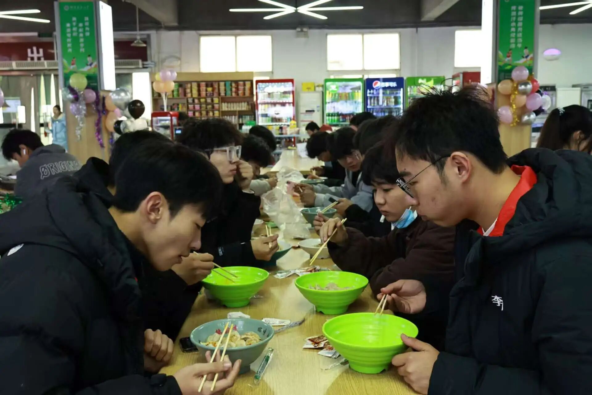 热腾腾的饺子陆续出锅,活动氛围愈发浓厚。同学们围坐一桌,品尝着鲜香可口的暖饺,冬日的寒意被驱散,彼此的距离也在谈笑间悄然拉近。与此同时,志愿者们带着一份份暖饺,走向坚守岗位的门卫与宿管,用实际行动表达敬意与感谢,让这份冬日暖意流淌在校园的每个角落。