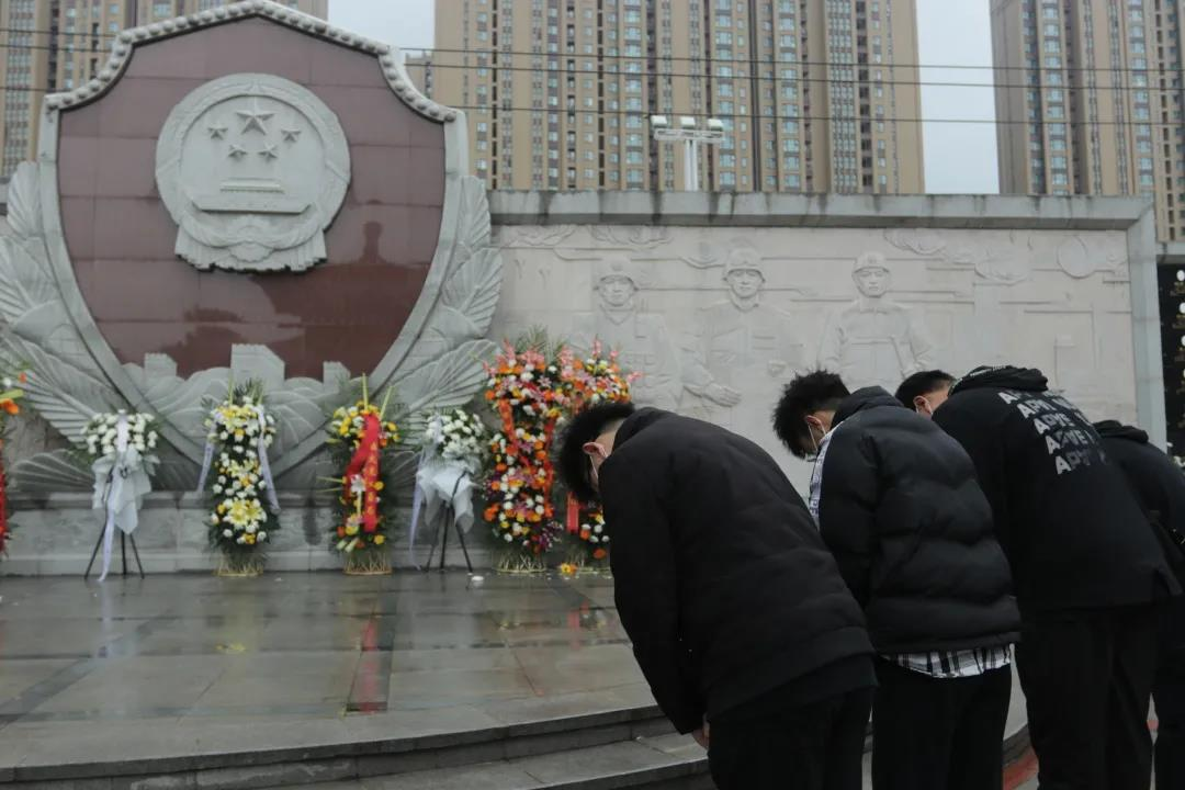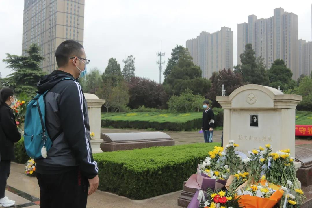 19级交通一班梅玉爽带领全体人员重温入团誓词,牢记作为青年大学生的初心使命。19级电信一班郭文博发表题为《铭记历史祭英烈,百年华诞跟党走》的演讲,表达她对革命先烈深刻怀念和崇高敬意,展现了当代青年学子致敬革命先烈、传承爱国精神的良好风貌。随后,全体成员缓步绕行,瞻仰纪念碑和烈士浮雕,参观吉鸿昌烈士、王远芳烈士、贾心斋先生、嵇文甫同志等众多为革命事业英勇奋战、流血牺牲的英雄墓碑以及为了打击犯罪、保卫人民而牺牲的英烈们,表达对心中的无限敬意与深切缅怀。