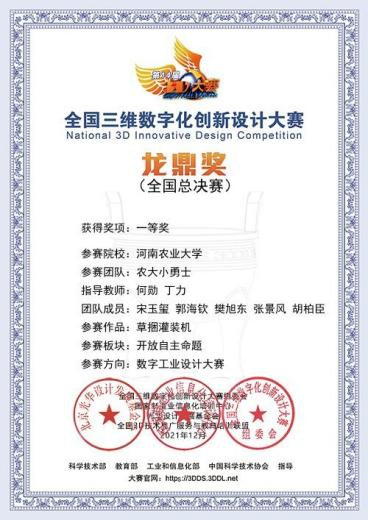 何勋、丁力老师指导的“农大小勇士”团队(研究生队员:宋玉玺、郭海钦、樊旭东、张景风、胡柏臣)凭借作品《草捆灌装机》取得大赛(数字工业方向)一等奖,由成人小说