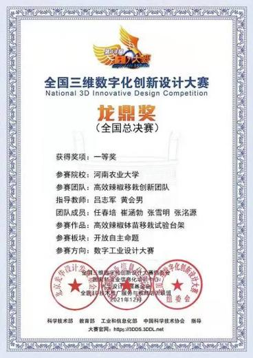 吕志军、黄会男老师指导的“高效辣椒移栽创新团队”(本科生队员:任春培、崔涵勃、张雪明、张洺源)凭借作品《高效辣椒钵苗移栽试验台架》取得大赛(数字工业方向)一等奖,由成人小说