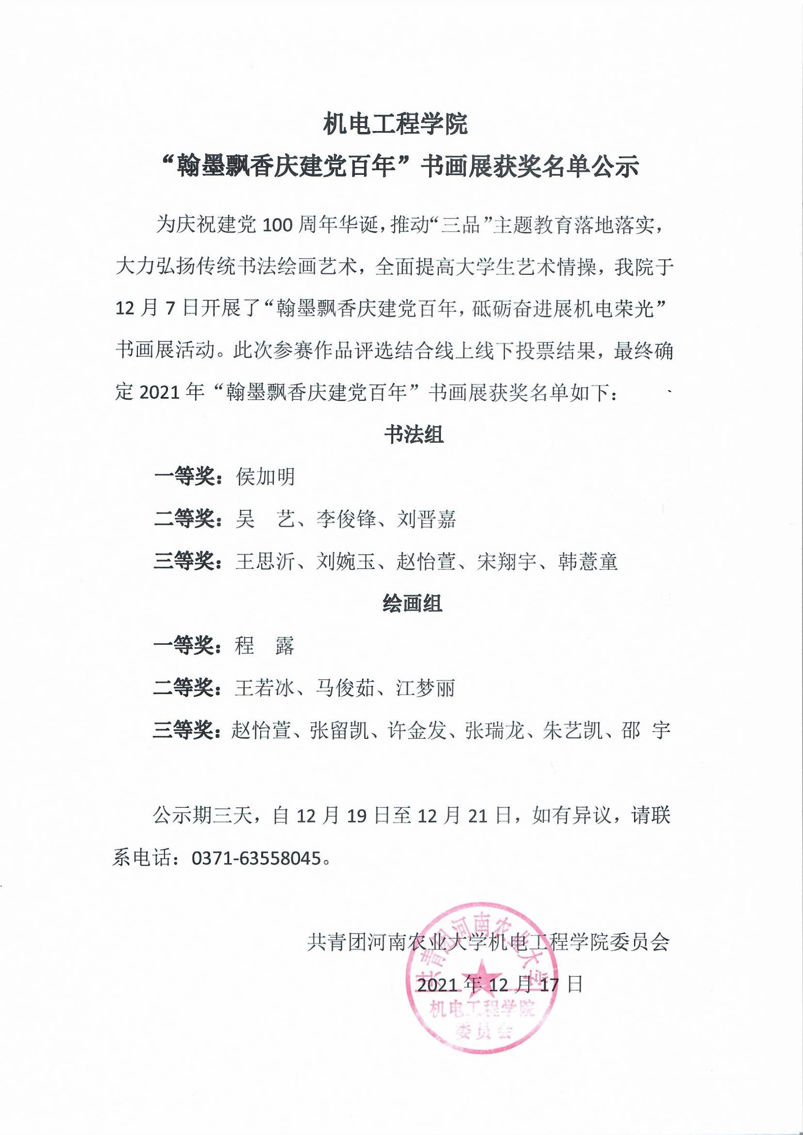 为庆祝建党100周年华诞,推动“三品”主题教育落地落实,大力弘扬传统书法绘画艺术,全面提高大学生艺术情操,成人小说 于12月7日开展了“翰墨飘香庆建党百年,砥砺奋进展机电荣光”书画展活动。此次参赛作品评选结合线上线下投票结果,最终确定2021年“翰墨飘香庆建党百年”书画展获奖名单如下:
