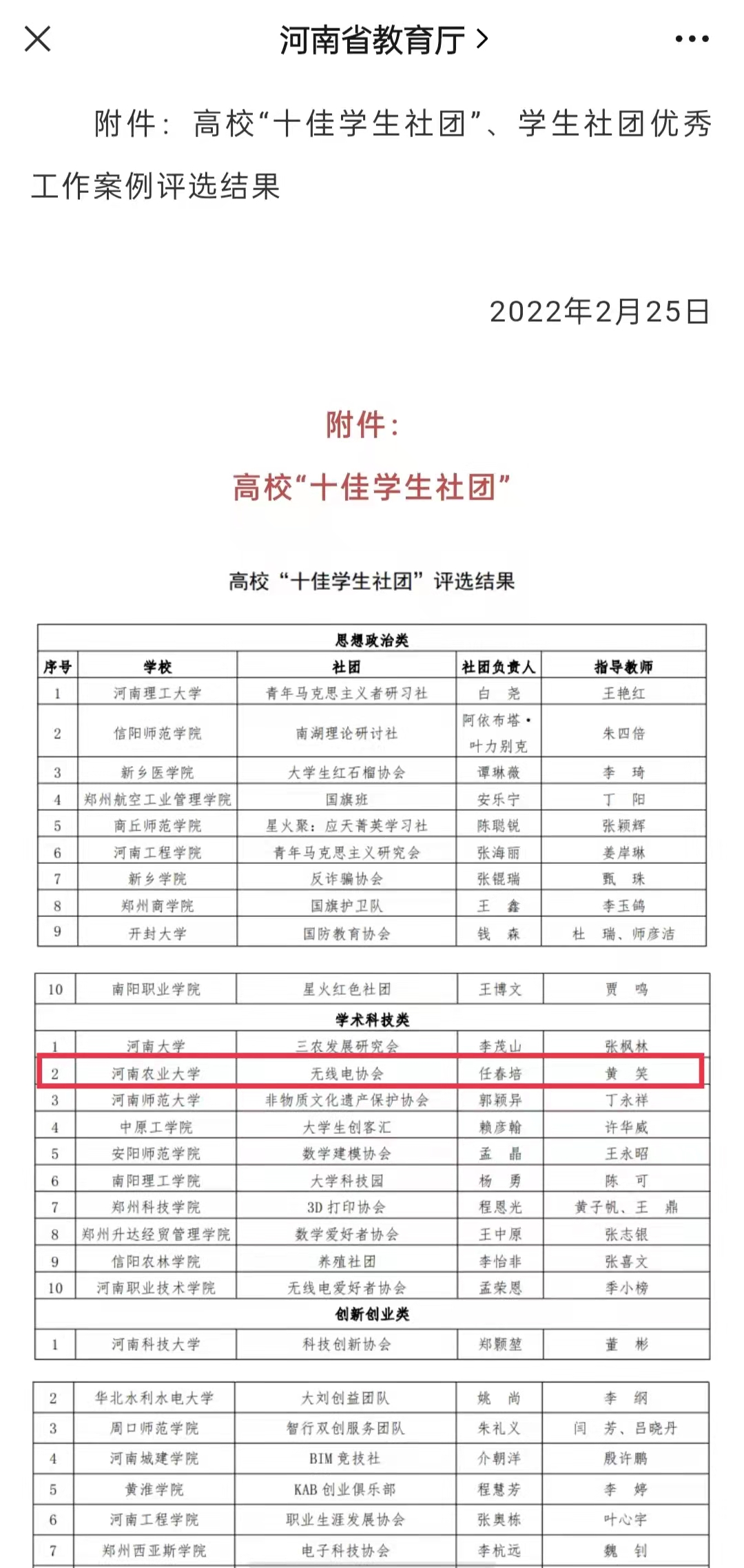 近日,根据省委教育工委、省教育厅《关于开展2021年全省高校学生社团品牌建设系列活动的通知》(教思政函〔2021〕766号)要求,经学校推荐、专家评审等环节,评选出了六类十佳学生社团共60支,优秀工作案例5个主题共28个。其中,成人小说 无线电协会成功入选高校“十佳学生社团”。