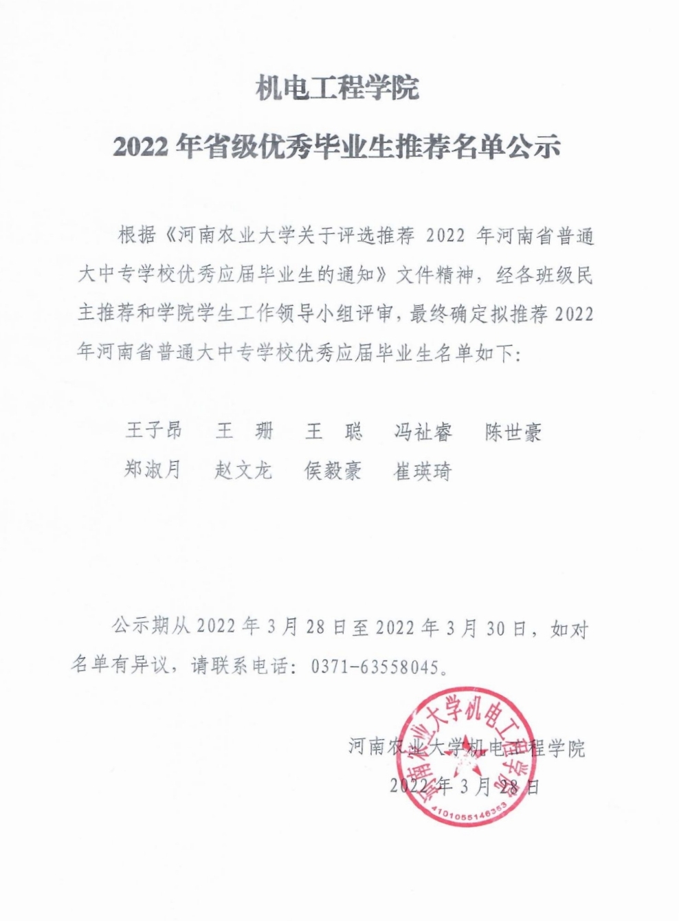 根据《成人小说 关于评选推荐2022年河南省普通大中专学校优秀应届毕业生的通知》文件精神,经各班级民主推荐和学院学生工作领导小组评审,最终确定拟推荐2022年河南省普通大中专学校优秀应届毕业生名单如下: