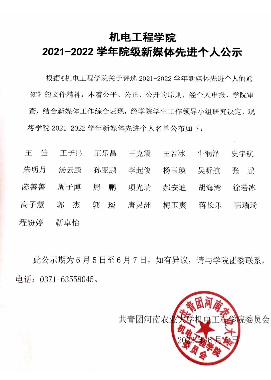 根据《成人小说 关于评选2021-2022学年新媒体先进个人的通知》的文件精神,本着公平、公正、公开的原则,经个人申报、学院审查,结合新媒体工作综合表现,经学院学生工作领导小组研究决定,现将学院2021-2022学年新媒体先进个人名单公示如下: