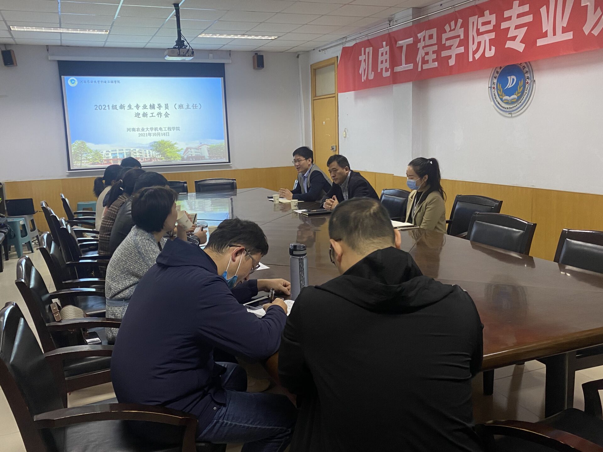 于院办二楼会议室召开2021级新生专业辅导员(班主任)迎新工作会,院党委副书记赵宁、团委书记黄笑、年级辅导员王晓楠及全体新生专业辅导员参加会议。