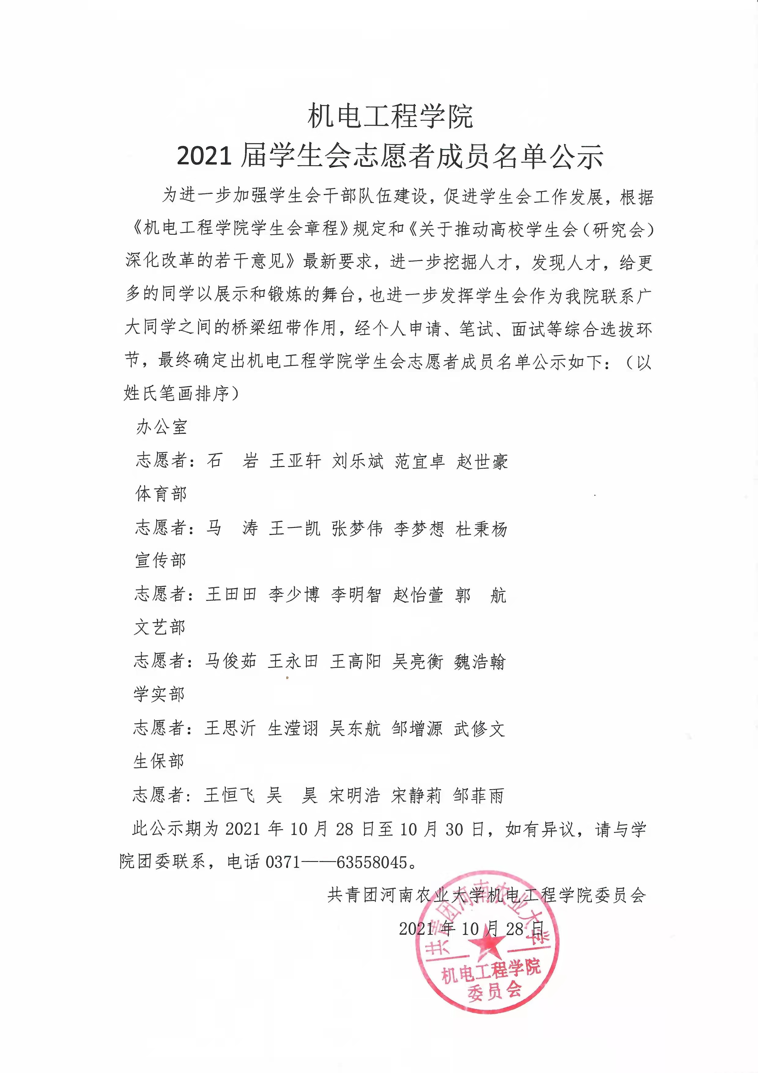 为进一步加强学生会干部队伍建设,促进学生会工作发展,根据《成人小说 学生会章程》规定和《关于推动高校学生会(研究会)深化改革的若干意见》最新要求,进一步挖掘人才,发现人才,给更多的同学以展示和锻炼的舞台,也进一步发挥学生会作为成人小说 联系广大同学之间的桥梁纽带作用,经个人申请、笔试、面试等综合选拔环节,最终确定出成人小说 学生会志愿者成员名单公示如下:(以姓氏笔画排序)