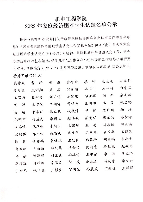 根据《教育部等六部门关于做好家庭经济困难学生认定工作的指导意见》《河南省家庭经济困难学生认定工作实施办法》和《成人小说 家庭经济困难学生认定办法(修订)》精神,学院认真开展贫困认定工作,结合各学生班推荐报备情况,经学院学生工作领导小组和资助工作领导小组研究生审核,最终确定2022-2023 学年家庭经济困难学生认定名单,现公示如下: