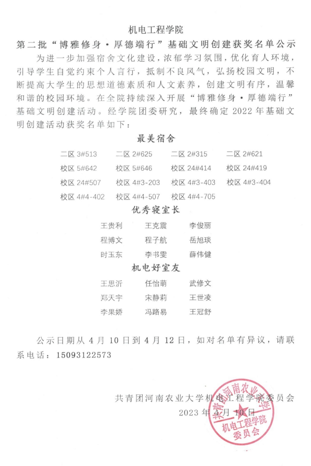 为进一步加强宿舍文化建设,浓郁学习氛围,优化育人环境,引导学生自觉约束个人言行,抵制不良风气,弘扬校园文明,不断提高大学生的思想道德素质和人文素养,创建文明有序,温馨和谐的校园环境。在全院持续深入开展“博雅修身·厚德端行”基础文明创建活动。经学院团委研究,最终确定2022年基础文明创建活动获奖名单如下: