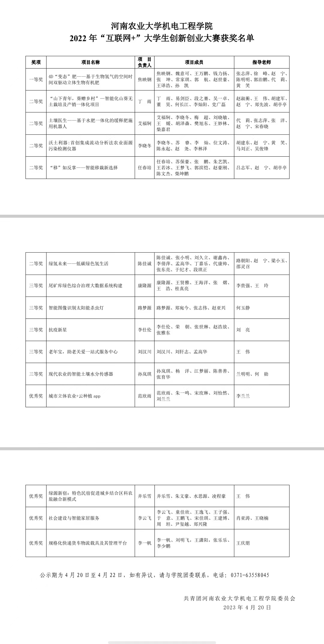 为贯彻落实河南省教育厅等部门《关于举办2022年河南省“互联网+”大学生创新创业大赛》文件精神,进一步激发学生创新创业热情,展示学院创新创业教育成果,不断提高创新创业人才培养水平,成人小说 广泛动员,积极组织开展了2022年“互联网+”大学生创新创业大赛,最终评选出一等奖1名,二等奖5名,三等奖5名,优秀奖4名。现将获奖名单公示如下:
