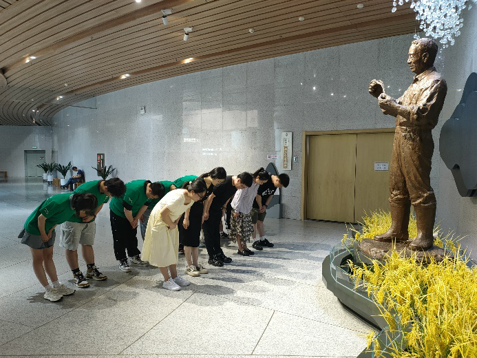 7月5日上午,队员们早早集合出发,前往实践第一站——隆平水稻纪念馆。在讲解员的带领下,实践队员们先后走进水稻历史厅、隆平厅和科技厅有序进行参观学习,通过实物、图片、多媒体等多种方式途径,学习与感悟中国水稻历史文化、中国杂交水稻科技成就和袁隆平院士孜孜不倦、不断创新的拓荒牛精神。参观结束后,师生在袁隆平院士铜像前深深鞠躬,对袁老致以真挚的敬意与深切的缅怀。