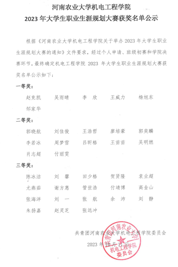 根据《成人小说 关于举办2023年大学生职业生涯规划大赛的通知》文件要求,经过个人申请、班级初赛和学院决赛环节,最终确定成人小说 2023年大学生职业生涯规划大赛获奖名单公示如下: