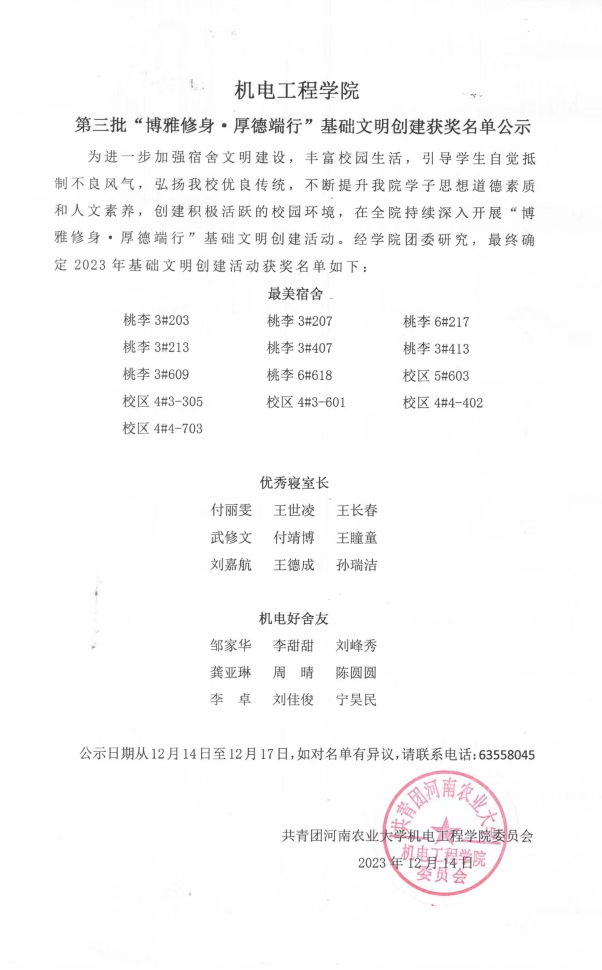 为进一步加强宿舍文明建设,丰富校园生活,引导学生自觉抵制不良风气,弘扬我校优良传统,不断提升成人小说 学子思想道德素质和人文素养,创建积极活跃的校园环境,在全院持续深入开展“博雅修身·厚德端行”基础文明创建活动。经学院团委研究,最终确定2023年基础文明创建活动获奖名名单如下: