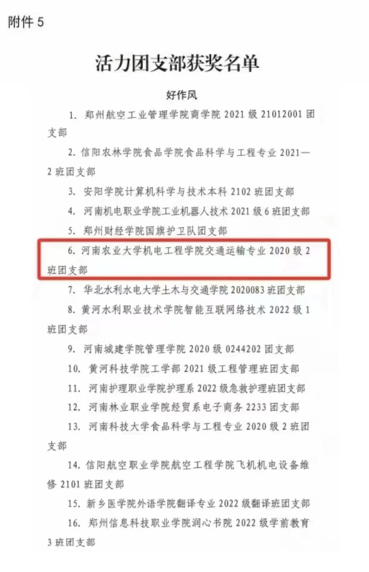 交通运输专业2020级2班团支部荣获2023河南省“活力团支部”。