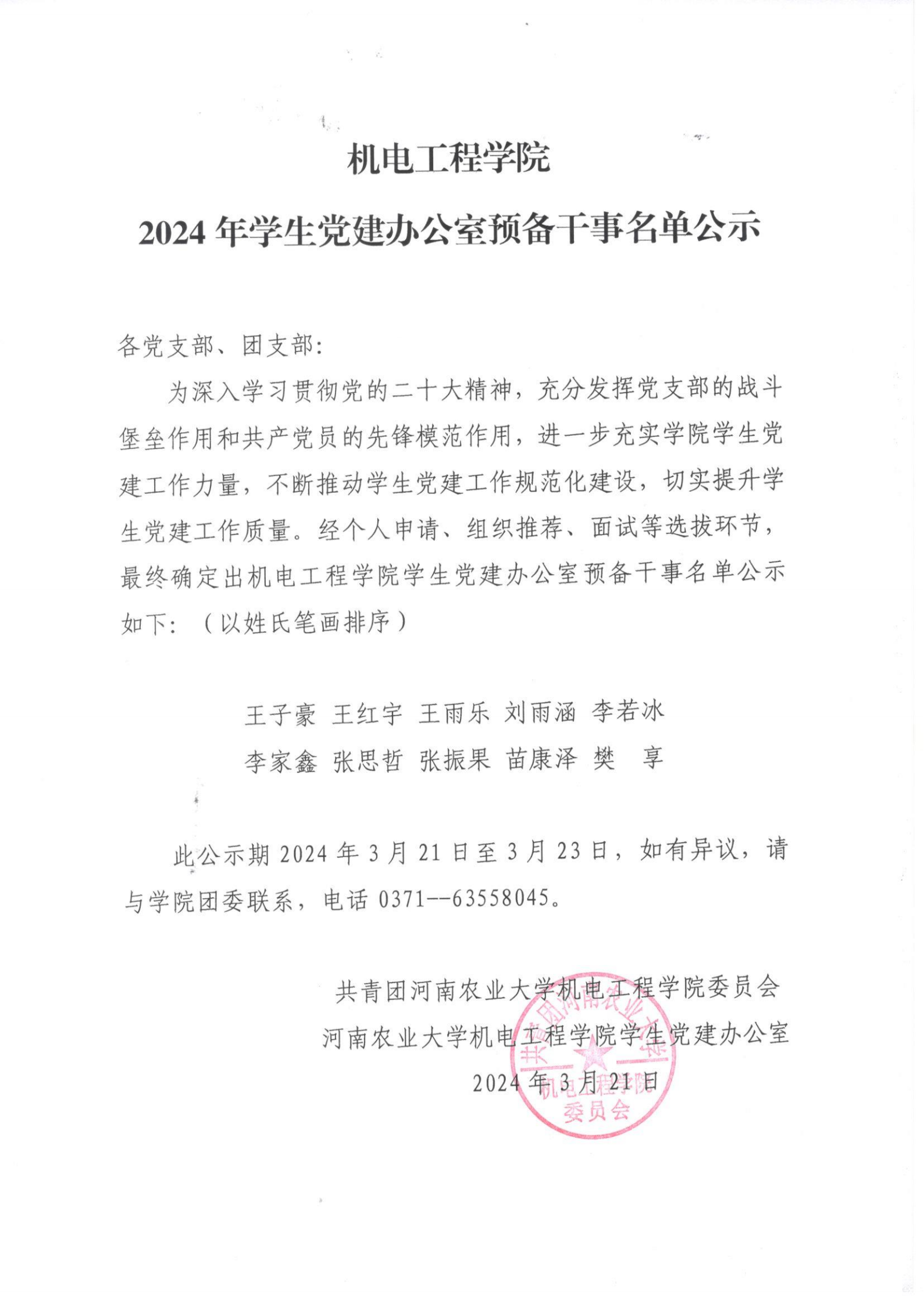 为深入学习贯彻党的二十大精神,充分发挥党支部的战斗堡垒作用和共产党员的先锋模范作用,进一步充实学院学生党建工作力量,不断推动学生党建工作规范化建设,切实提升学生党建工作质量。经个人申请、组织推荐、面试等选拔环节,最终确定出成人小说 学生党建办公室预备干事名单公示如下: (以姓氏笔画排序)