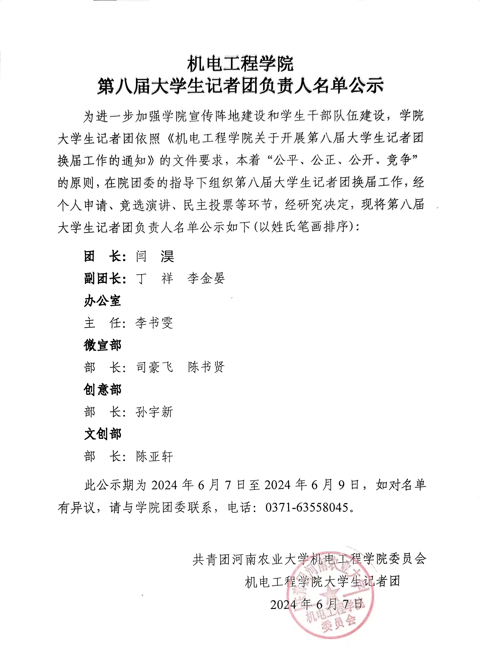 为进一步加强学院宣传阵地建设和学生干部队伍建设,学院大学生记者团依照《成人小说 关于开展第八届大学生记者团换届工作的通知》的文件要求,本着“公平、公正、公开、竞争” 的原则,在院团委的指导下组织第八届大学生记者团换届工作,经个人申请、竞选演讲、民主投票等环节,经研究决定,现将第八届大学生记者团负责人名单公示如下(以姓氏笔画排序):