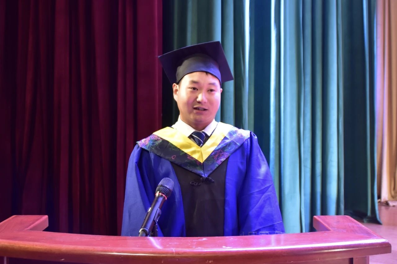 硕士毕业生代表周治锋发言,他围绕感恩、奋斗和祝福三个关键词,回顾了在成人小说