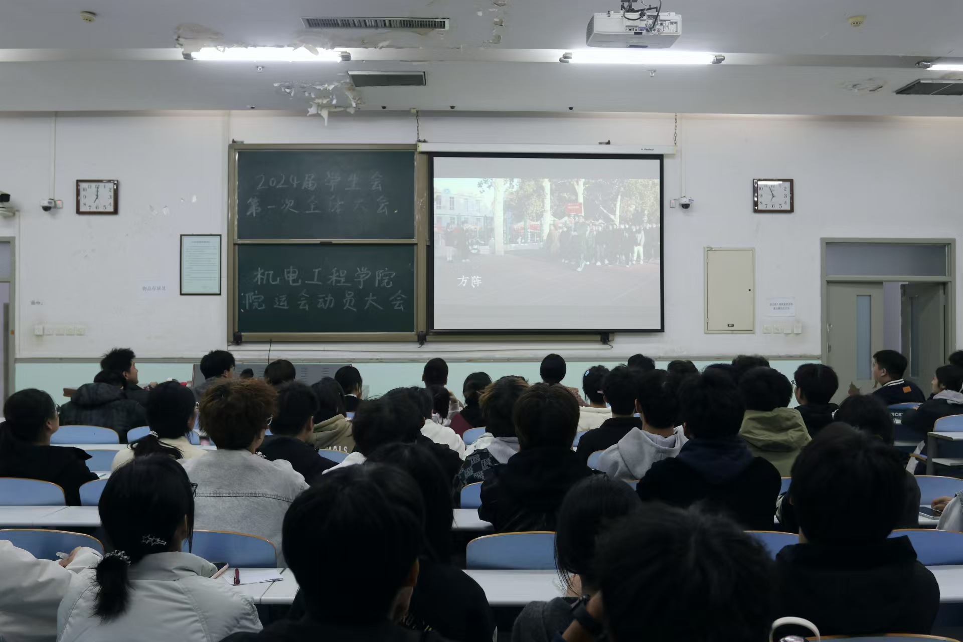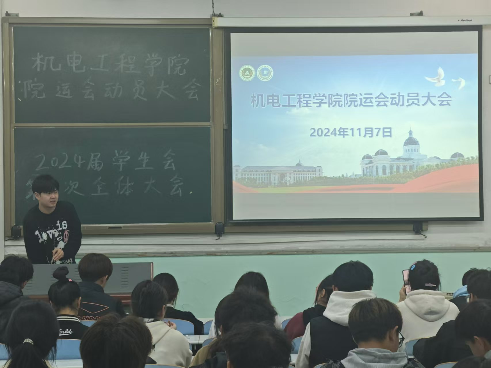 于文化路校区工程楼206召开院运会动员大会,院团委副书记胡亭亭、年级辅导员梁凯凯出席会议,全体学生会成员参加会议。