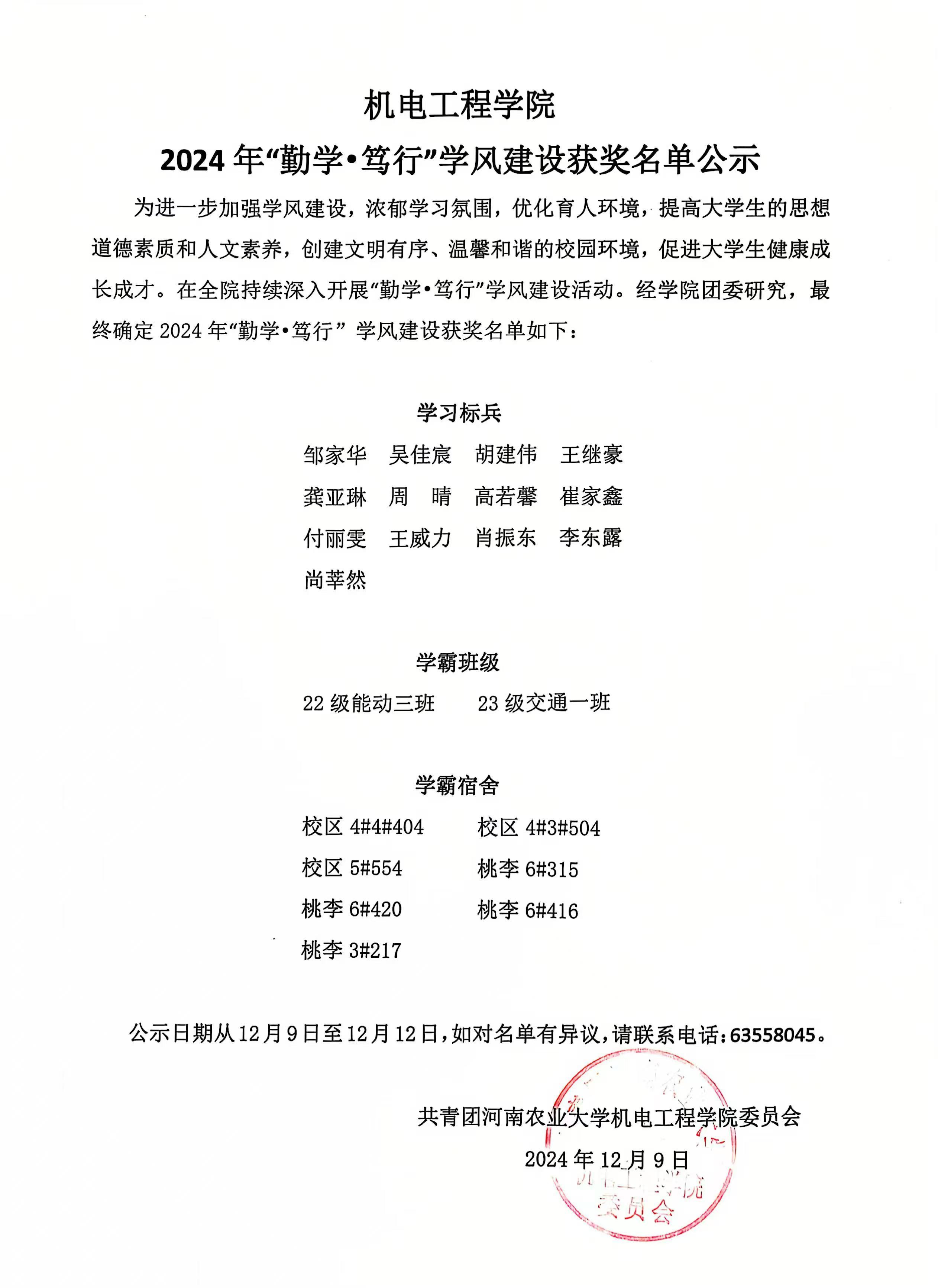 为进一步加强学风建设,浓郁学习氛围,优化育人环境,提高大学生的思想道德素质和人文素养,创建文明有序、温馨和谐的校园环境,促进大学生健康成长成才。在全院持续深入开展“勤学•笃行”学风建设活动。经学院团委研究,最终确定2024年“勤学•笃行”学风建设获奖名单如下: