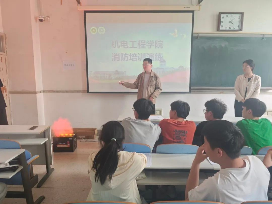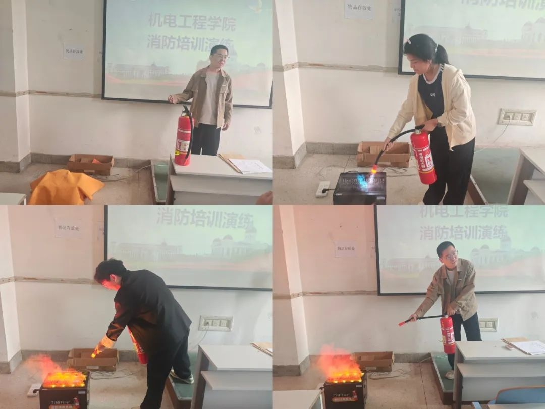 当日下午,团委副书记胡亭亭与辅导员梁凯凯于教室组织开展专题演示。他们结合多媒体课件以理论讲解,系统阐述消防安全知识。随后通过实物操作,详细说明灭火器“提、拔、握、压”的操作口诀,以及灭火毯覆盖火源的规范动作,带领同学们逐一练习,确保基础消防技能入脑入心。