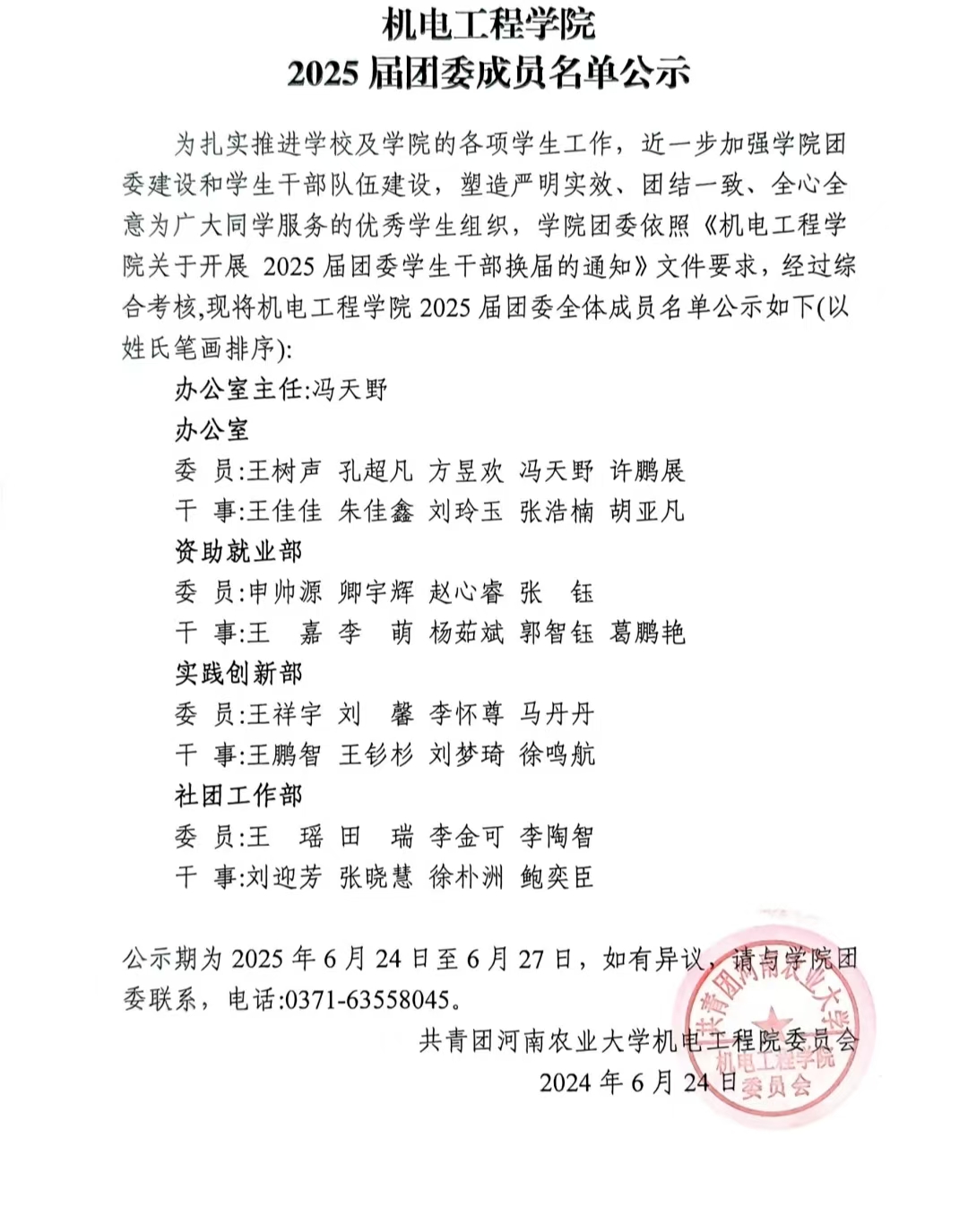 为扎实推进学校及学院的各项学生工作,近一步加强学院团委建设和学生干部队伍建设,塑造严明实效、团结一致、全心全意为广大同学服务的优秀学生组织,学院团委依照《成人小说 关于开展2025届团委学生干部换届的通知》文件要求,经过综合考核,现将成人小说 2025届团委全体成员名单公示如下(以姓氏笔画排序):