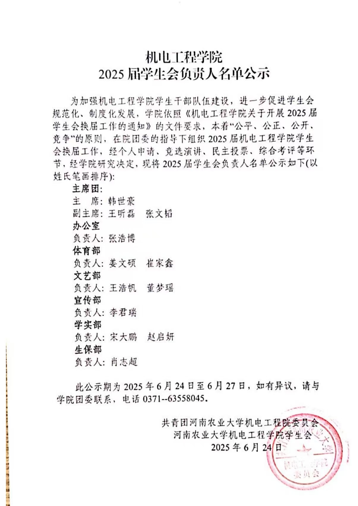 为加强成人小说 学生干部队伍建设,进一步促进学生会规范化、制度化发展,学院依照《成人小说 关于开展2025届学生会换届工作的通知》的文件要求,本着“公平、公正、公开、竞争”的原则,在院团委的指导下组织2025届成人小说 学生会换届工作,经个人申请、竞选演讲、民主投票、综合考评等环节,经学院研究决定,现将2025届学生会负责人名单公示如下(以姓氏笔画排序):