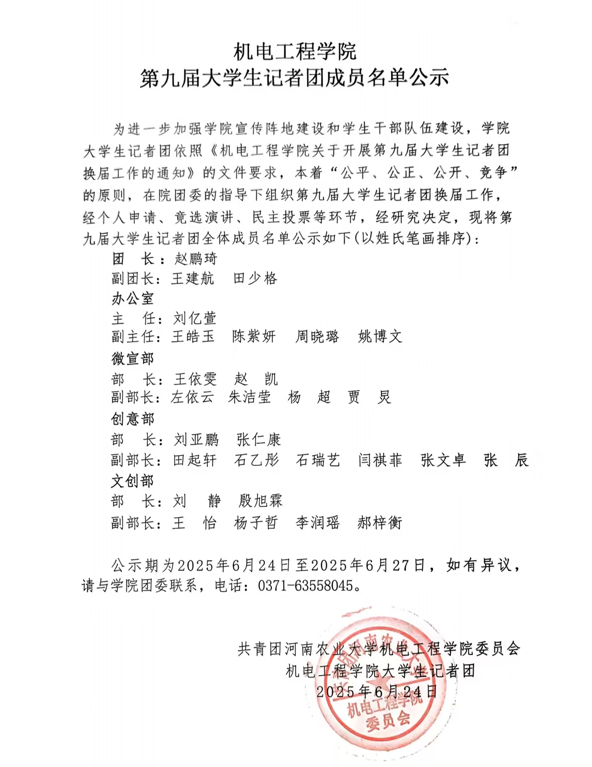 为进一步加强学院宣传阵地建设和学生干部队伍建设,学院大学生记者团依照《成人小说 关于开展第九届大学生记者团换届工作的通知》的文件要求,本着“公平、公正、公开、竞争”的原则,在院团委的指导下组织第九届大学生记者团换届工作,经个人申请、竟选演讲、民主投票等环节,经研究决定,现将第九届大学生记者团全体成员名单公示如下(以姓氏笔画排序):