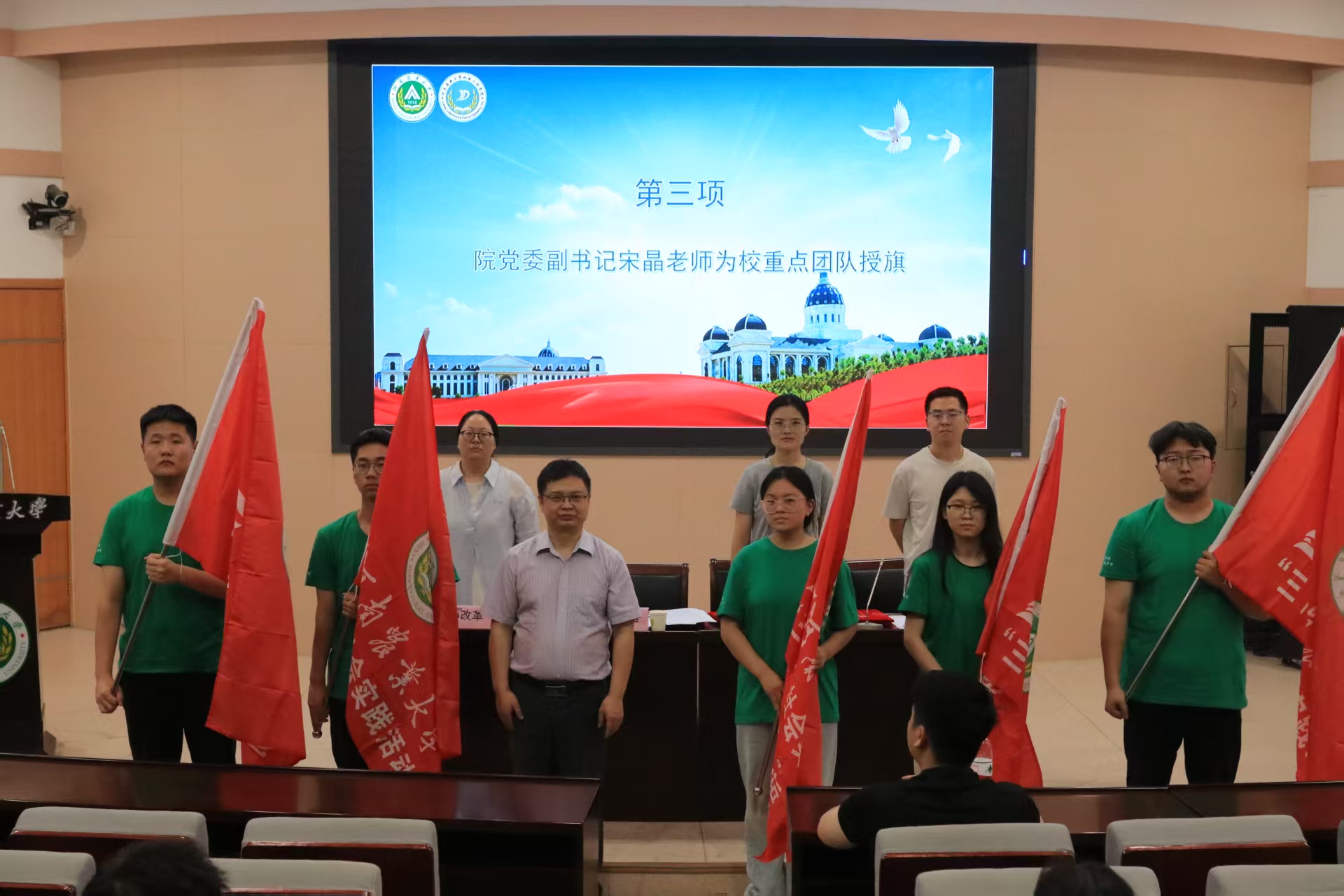 社会实践团队代表李陶智发言表示,参与社会活动可帮助青年明晰自身与市场需求的差距,找准定位。“三下乡”通过科技助农、科普宣讲等服务,既能丰富乡村文化、提升教学质量,又能推动乡村振兴。作为成员,他承诺将严守纪律、履职尽责,在团队协作中展现新时代青年担当。最后宋晶为校重点团队授旗并合影留念。