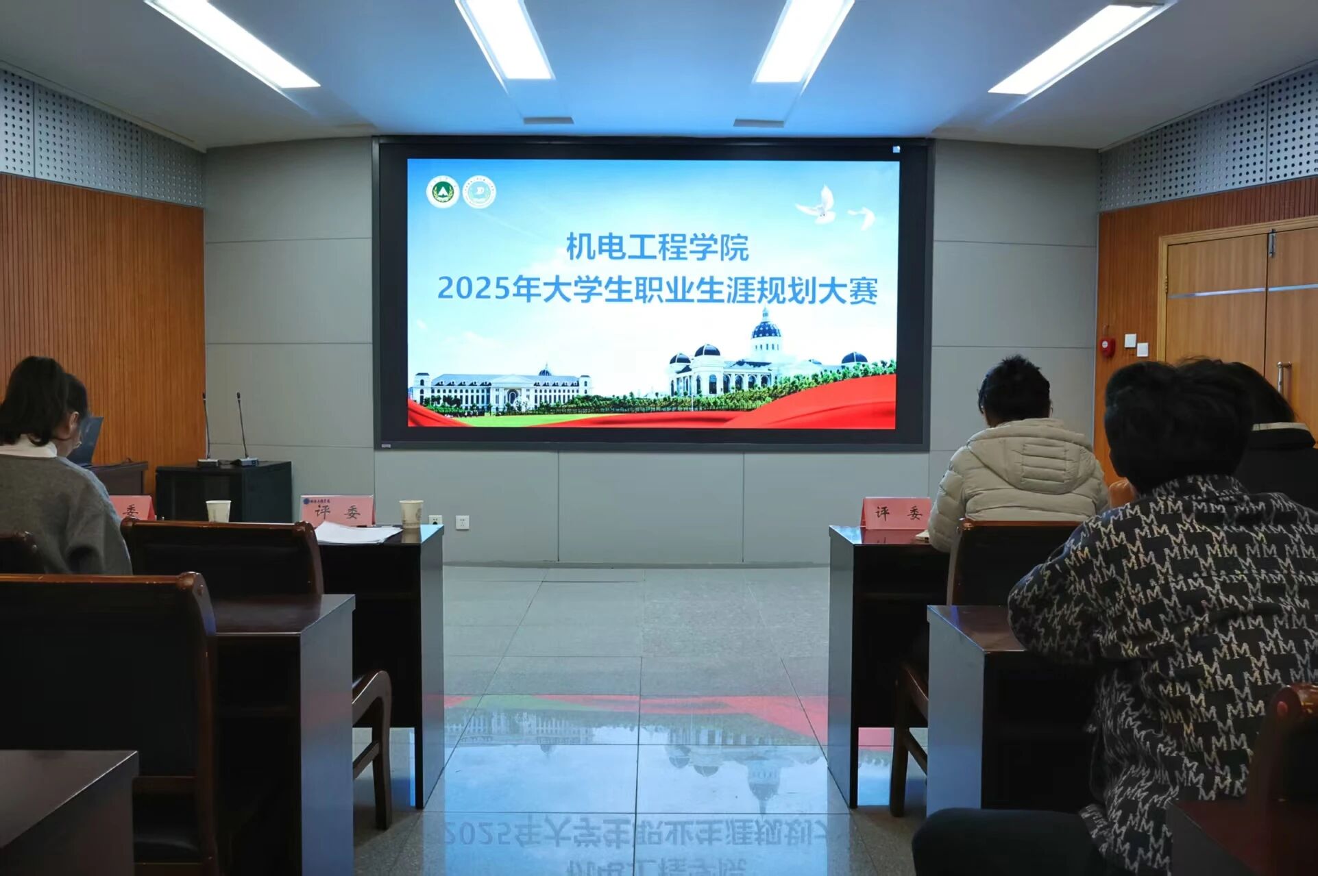 于文化路100人报告厅举办2025年大学生职业生涯规划大赛。院党委副书记宋晶、多位博士兼职辅导员及年级辅导员梁凯凯出席此次大赛。比赛设主题陈述与现场答辩两大环节。\