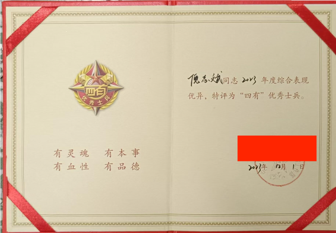 倪志斌是河南安阳人,身为中共党员的他,怀揣家国情怀于2022年3月入伍,服役于火箭军某旅。服役期间,他先后参与重大实战演习、沿海三级战备值班任务,凭借过硬表现,于2023年12月荣获“四有”优秀士兵称号及个人嘉奖。两年军旅生涯,让他褪去稚气,锤炼出坚韧意志、高度自律与强烈的责任担当,那段被汗水浸润的岁月,成为他人生最宝贵的财富。