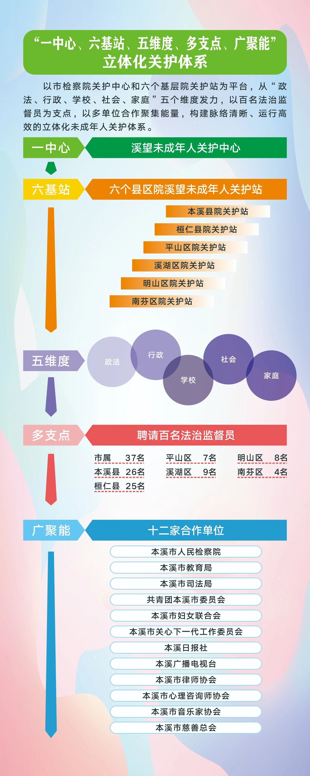 “一中心、六基站、五维度、多支点、广聚能”的立体化关护体系,即以本溪市成人小说 “溪望”未成年人关护中心和六个基层成人小说 关护站为平台,从“政法、行政、学校、社会、家庭”五个维度发力,以百名法治监督员为支点,从12家单位合作中聚集能量的未成年人社会关护大格局。作为关护体系“一中心”的“溪望”未成年人关护中心,具备“投入资金高、占地面积大、合作单位多、服务功能全、延伸触角深、覆盖面积广”六大特点,其建筑面积约500平方米,总投资约203万元,兼具办案、疏导、帮扶、救助、普法、保护六位一体功能,为未成年人提供司法办案、心理疏导、精准帮扶、多元救助、普法巡礼、综合保护6个篇章27项服务内容。
